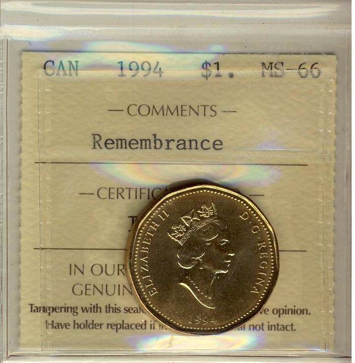 1994 $1 Remembrance MS66. Just 1 listed in POP report.
