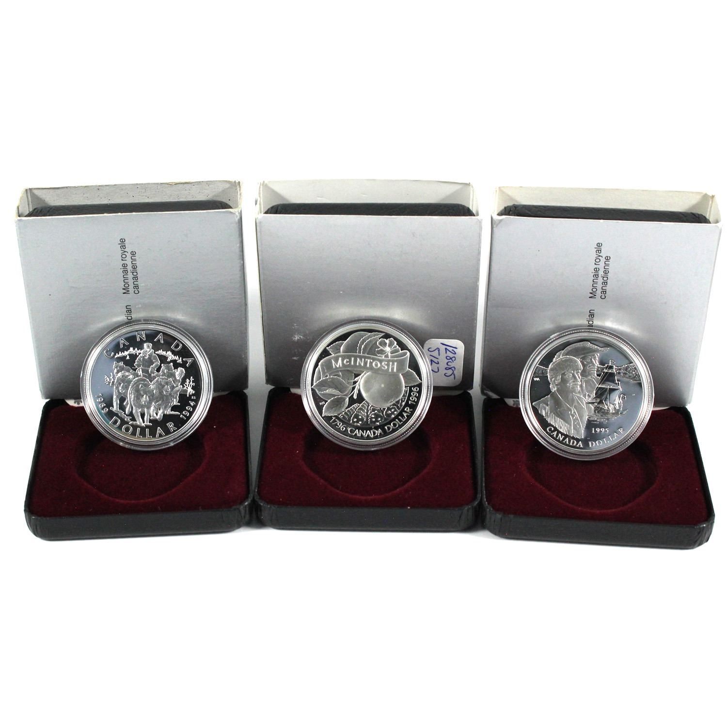 1994-1996 Canada Proof Commemorative Silver Dollars. Each coin comes with all original packaging however some coins are toned and packaging contains various imperfections. 3pcs
