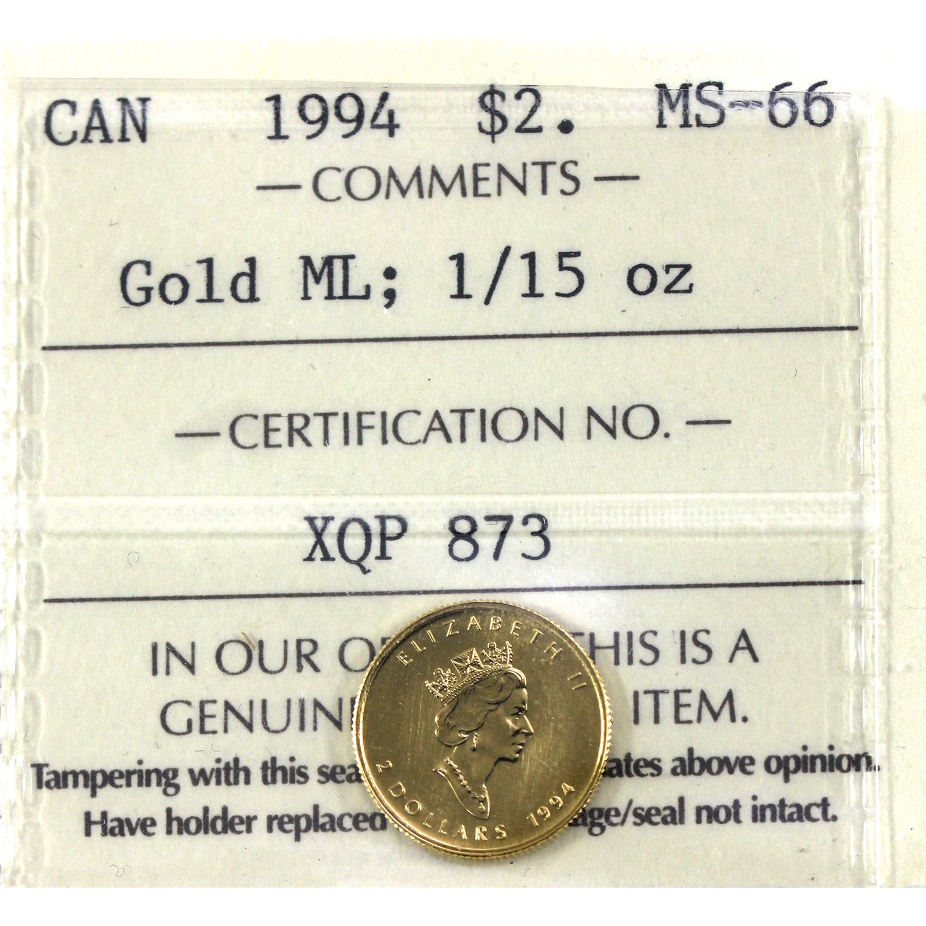 Canada 1994 1/15oz. $2 Gold Maple Leaf ICCS Certified MS66 (Tax Exempt). Produced only in 1994, the 1/15oz Gold Maples are extremely hard to find in today's market with a listed mintage of only 5,493.