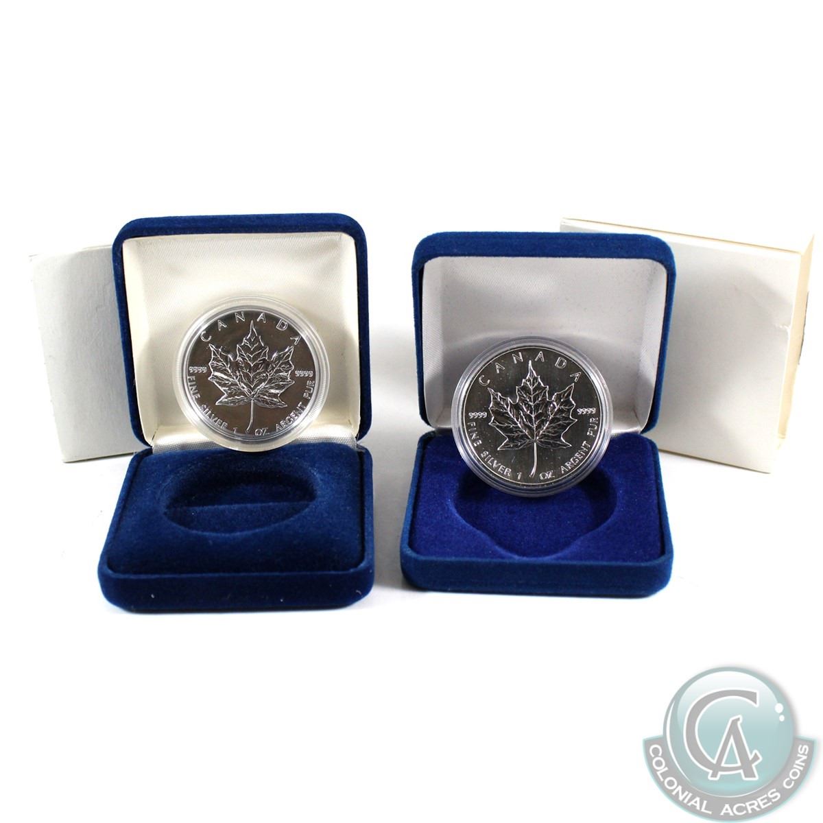 1994 & 2003 Canada $5 Fine Silver Maple Leaf (Tax Exempt) Coins come encapsulated in issued blue Clamshell Cases with outer sleeve (may be lightly toned). 2pcs.
