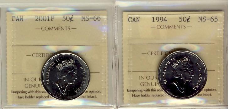 1994 50¢ MS65 & 2001P MS66. Lot of 2 coins both ICCS graded.
