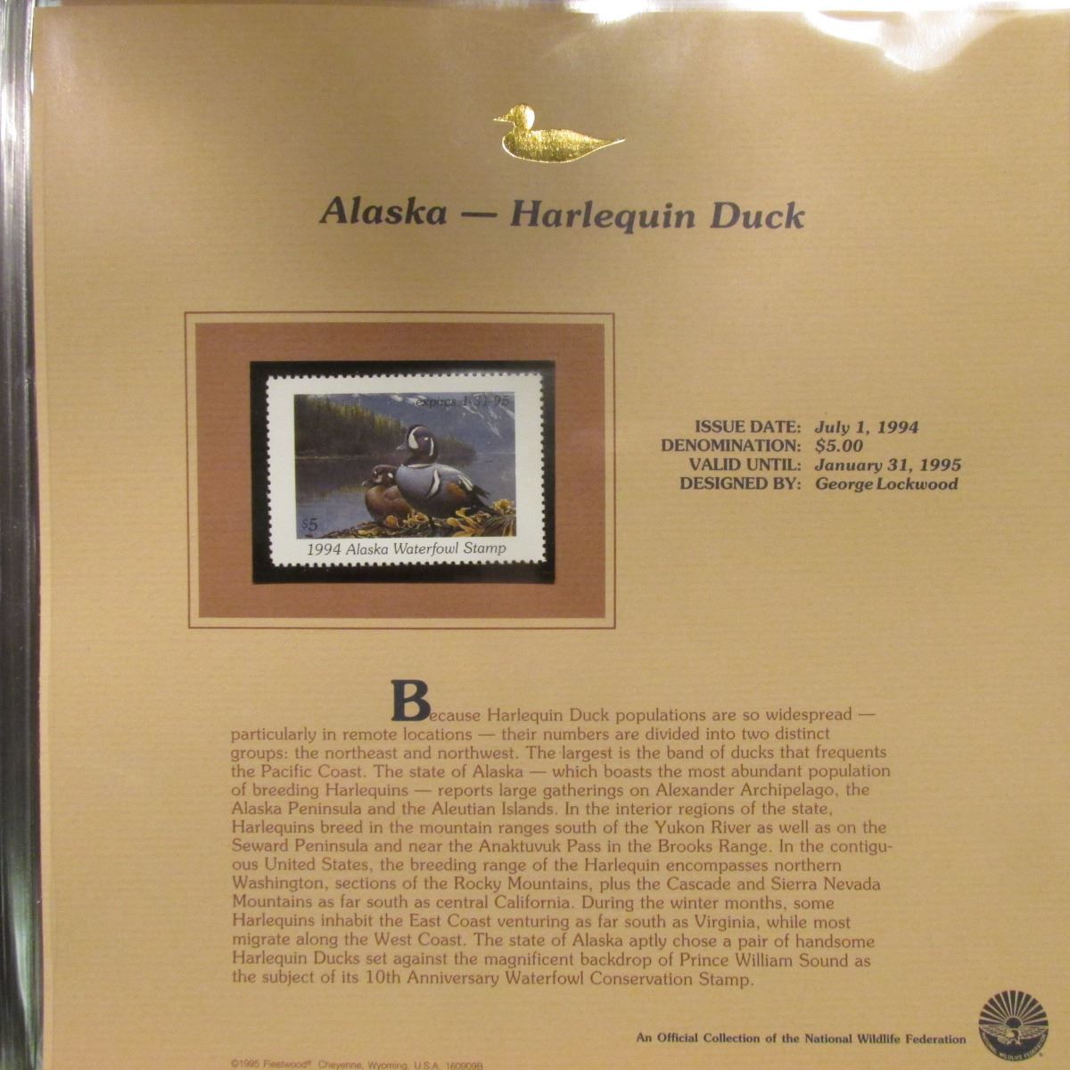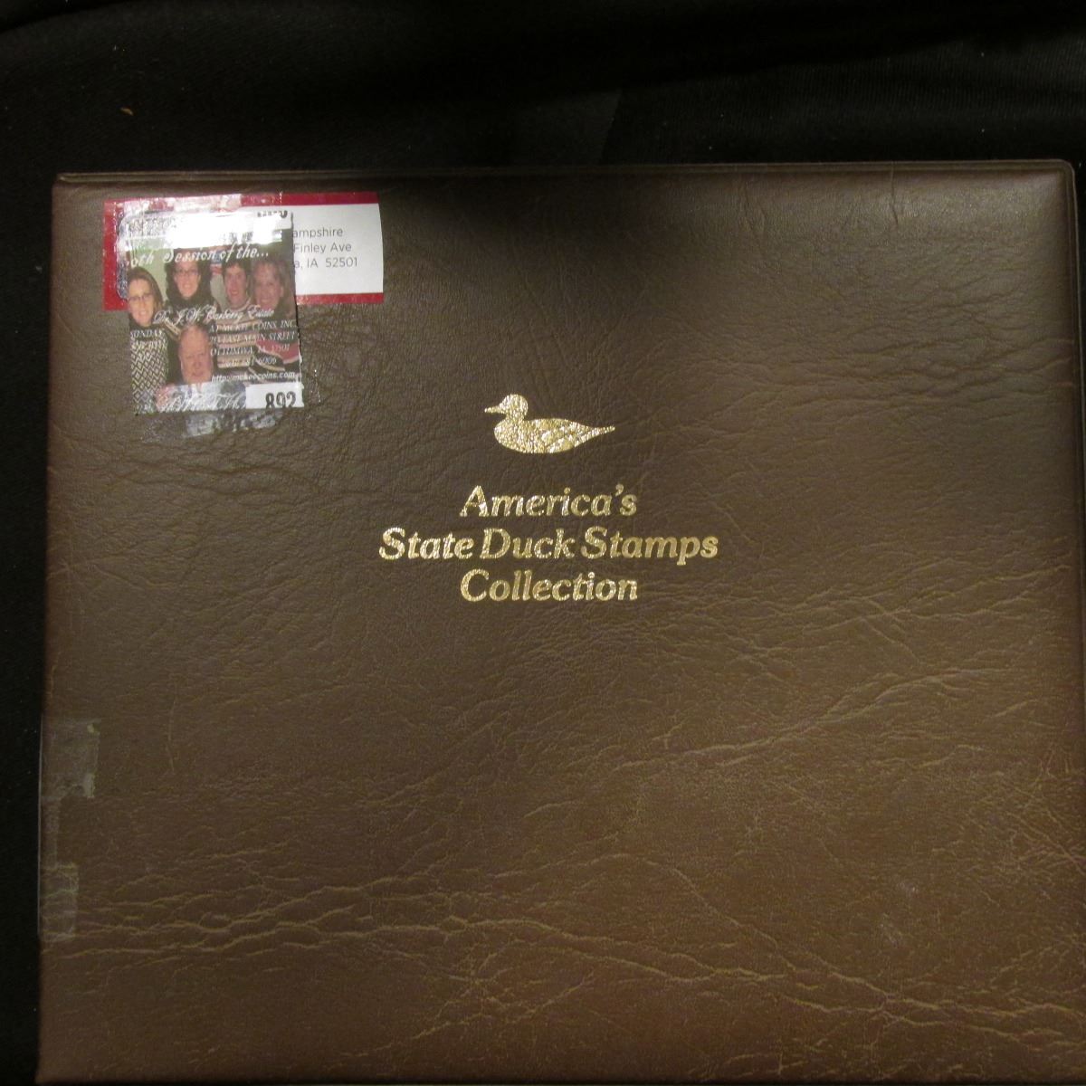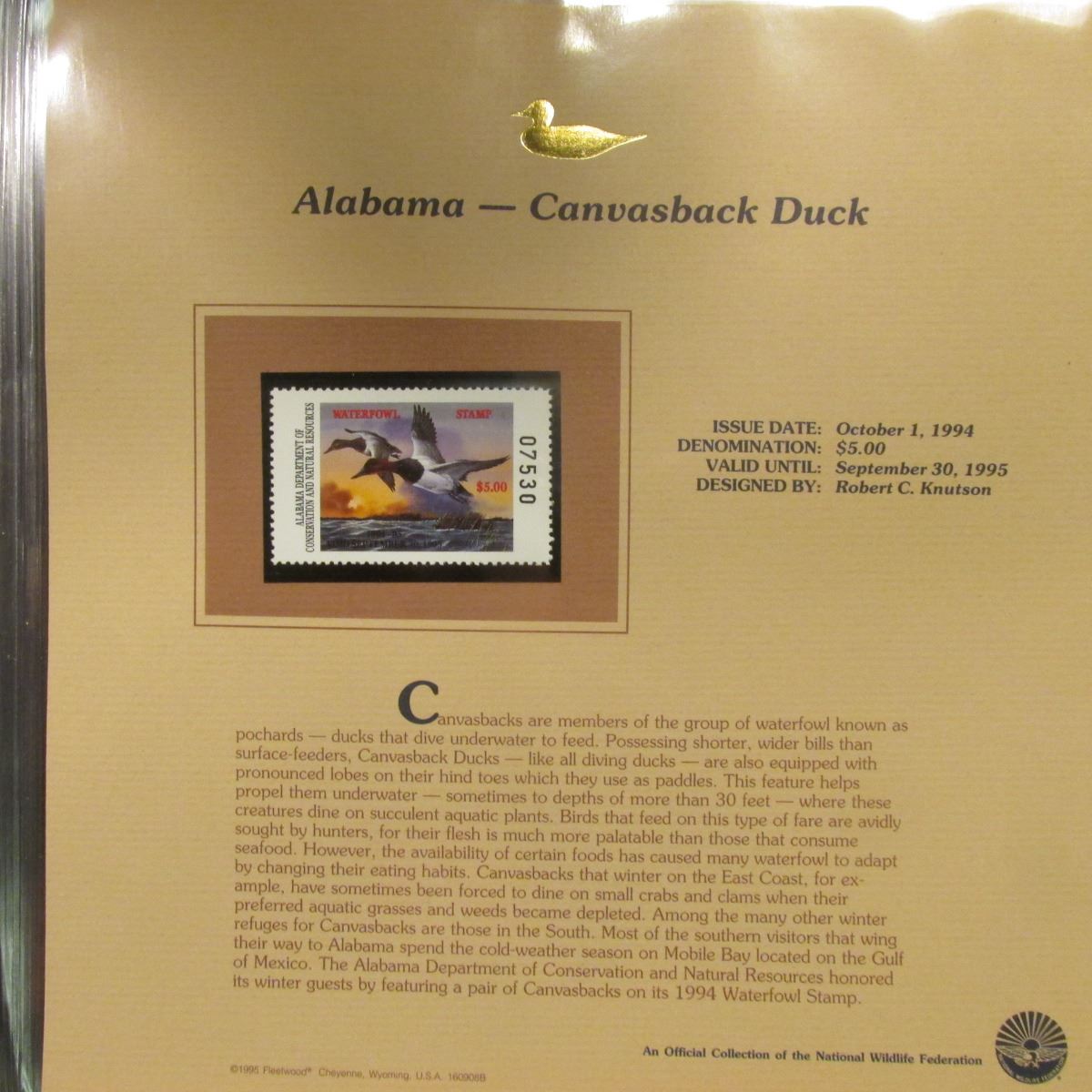 1994 Album "America's State Duck Stamps Collection A complete mint stamp collection of new and beautiful wildlife conservation stamps inspired by the popular Federal Duck Stamp and issued by forty-eight American states in 1994", These are all cherry Mint condition and in a simulated leather binder with gold lettering. Valued by Sam Houston Duck Co. at over $450.00.