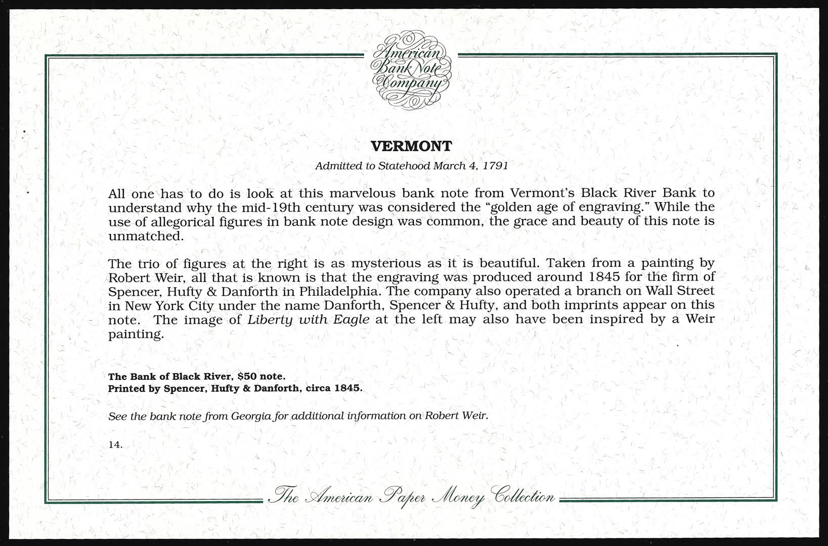 One 1994 American Bank Note Company Intaglio Print Bank of Black River Proctorsville, VT.