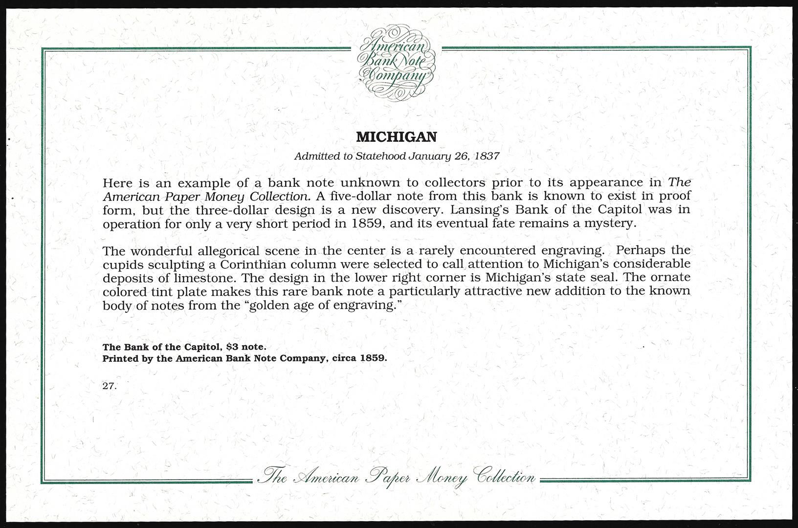 One 1994 American Bank Note Company Intaglio Print Bank of the Capitol Lansing, MI.