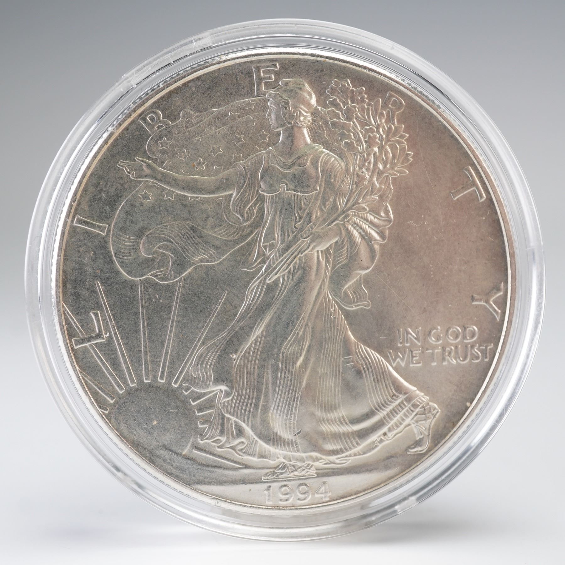 A 1994 American Silver Eagle coin containing one troy ounce of .999 fine silver. The obverse depicts Liberty striding toward the sunrise, draped in the American flag and carrying laurel and oak branches, accompanied by the inscriptions LIBERTY, IN GOD WE TRUST, and the year 1994 below. The reverse portrays a heraldic eagle behind a shield clutching arrows and an olive branch, encircled with UNITED STATES OF AMERICA, 1 oz. FINE SILVER - ONE DOLLAR. Presented in a clear, round holder.