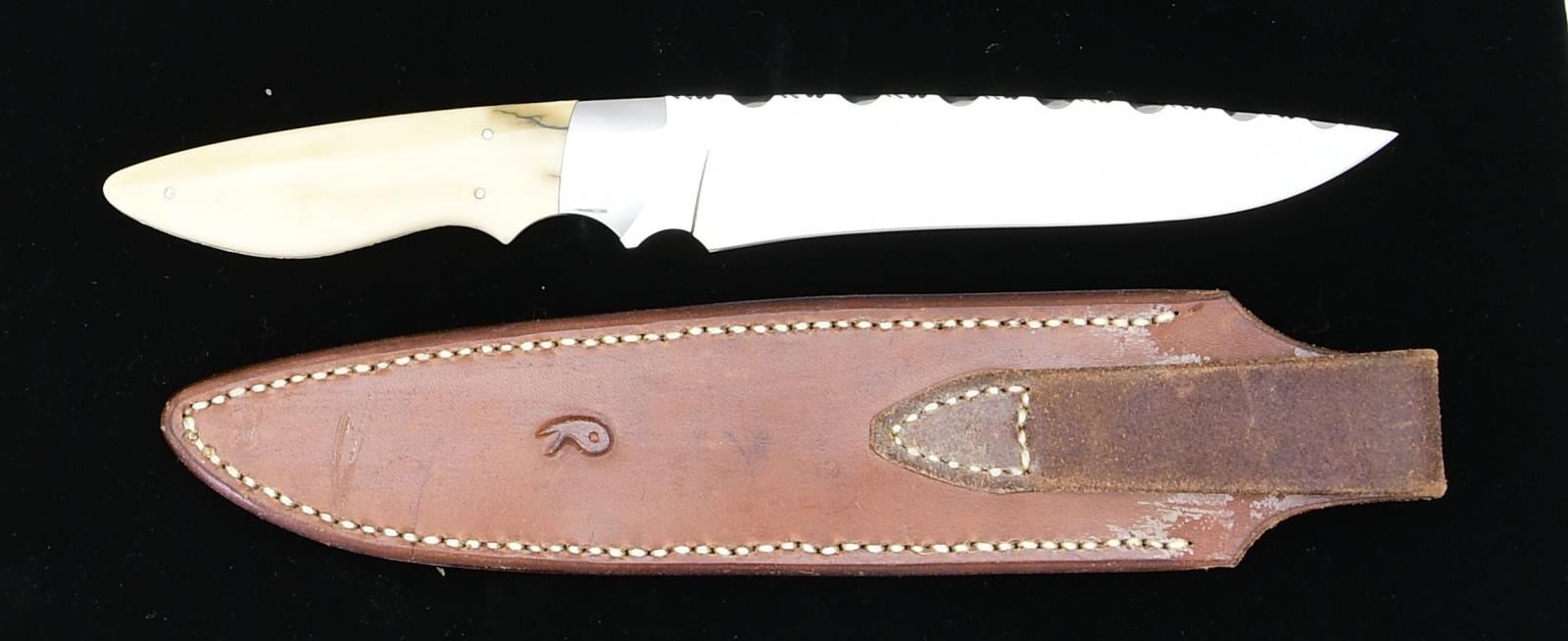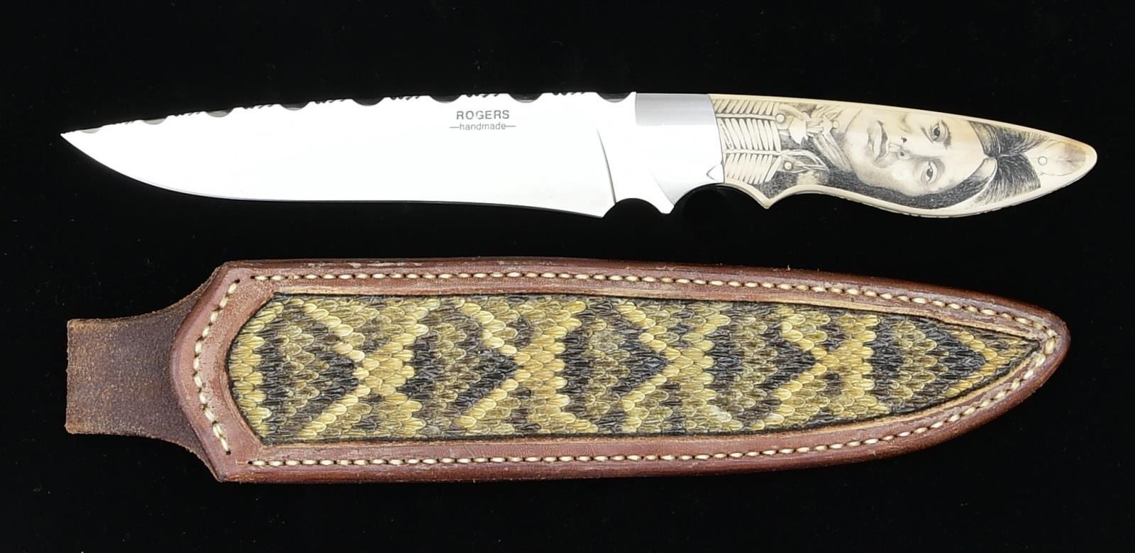 CUSTOM KNIFE. Overall: 12". Blade 7". Full tang & spine have sculpted pattern. Stainless bolster w/ finger groove. Bone scales w/ ornate scrimshaw of an unknown Indian Chief. Brown leather sheath w/ snake skin inlay & stylized "R" on back. CONDITION: knife & sheath appear near excellent. PROVENANCE: From the personal collection of Brad Shepherd. (02-19842-6/MD). $500-750.