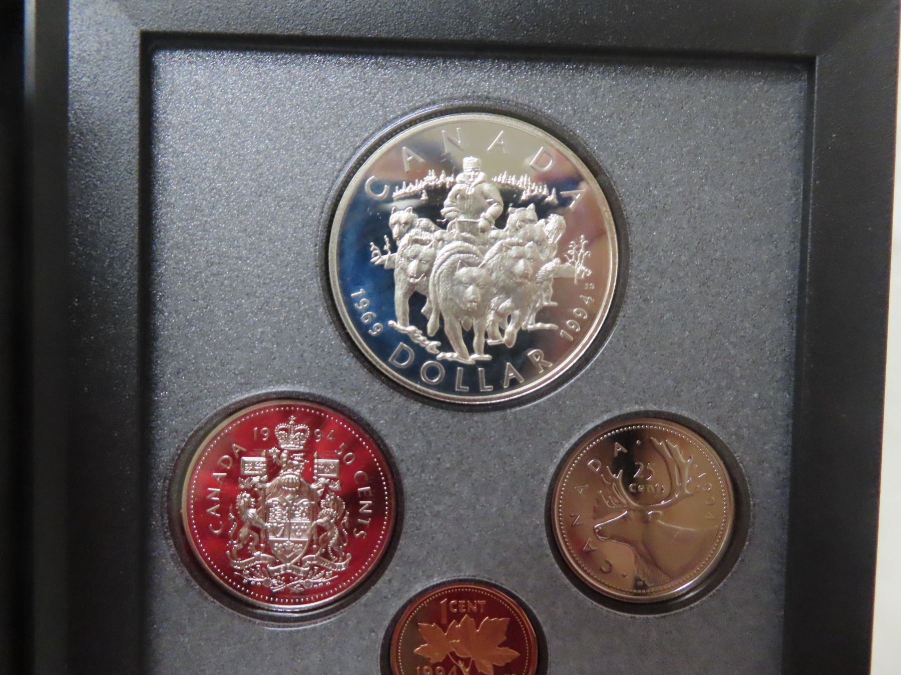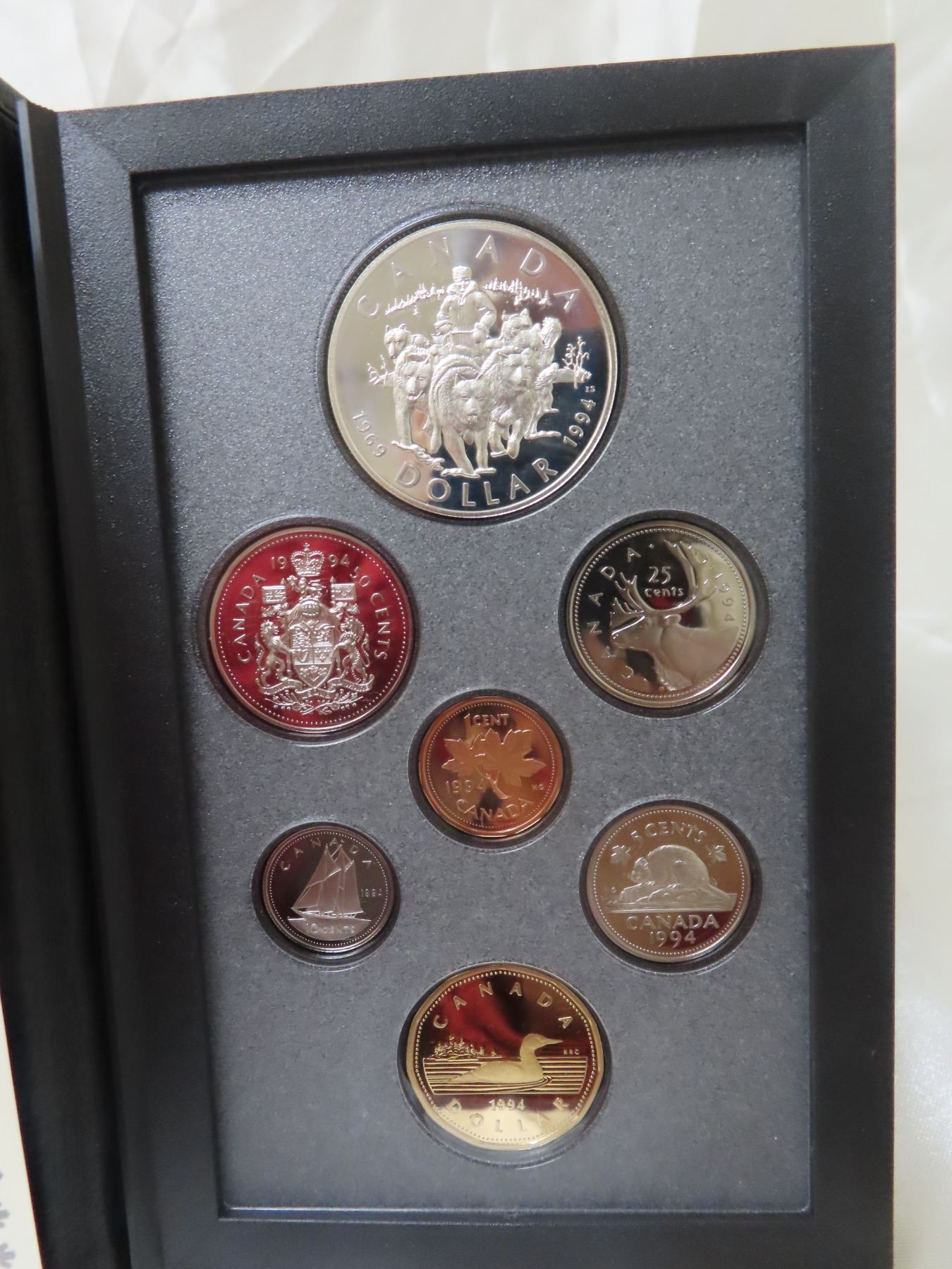 1994 Double Dollar Proof Set. Silver Dollar marks the last RCMP dog sled team. 7-coin Proof Set. All coins have Ultra Heavy Cameos. Housed in its original Royal Canadian Mint case of issue. Includes Certificate of Authenticity.