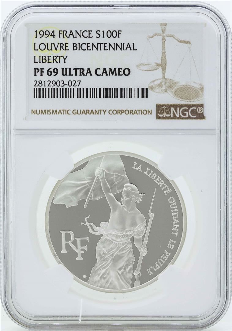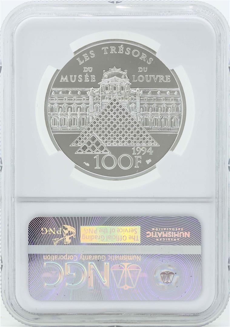 One 1994 France 100 Francs Louvre Bicentennial Silver Coin NGC PF69 Ultra Cameo. NGC Certified.