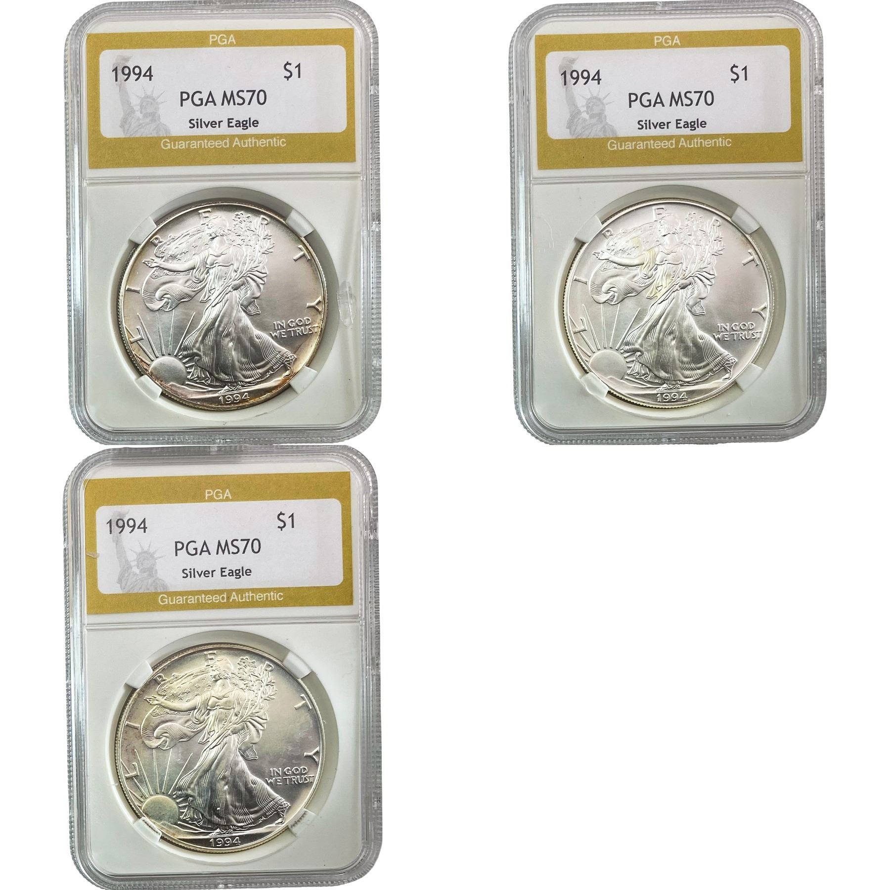 1994 GEM BU Silver Eagle [3 Coins] PGA MS70