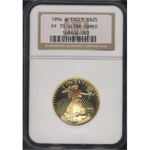 <b>1994 Gold Eagle $25. NGC graded PF70 UC.</b> Collector's Universe price: $4000. Luxuriant reddish-gold color is seen over each side with simply gorgeous ultra cameo devices providing the contrast. A perfect Proof 70 example <b>(PCGS # 9883)</b>