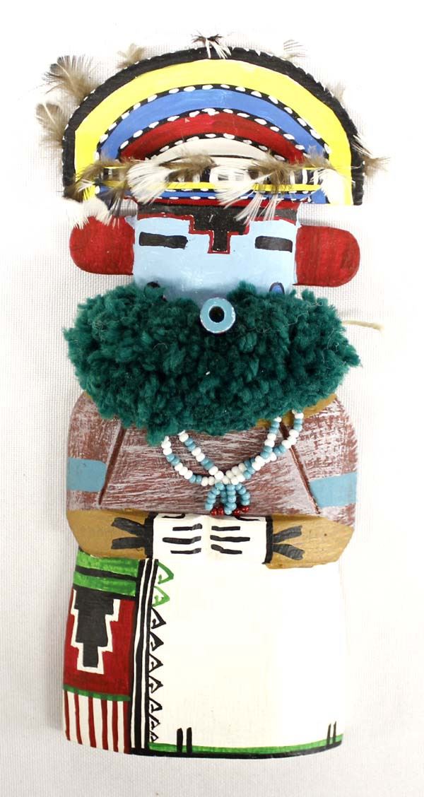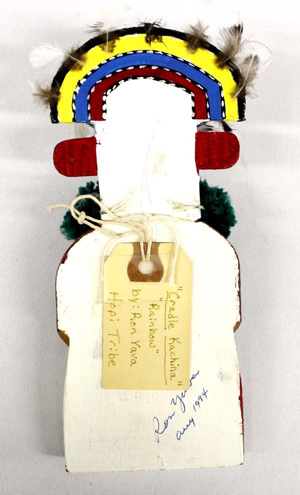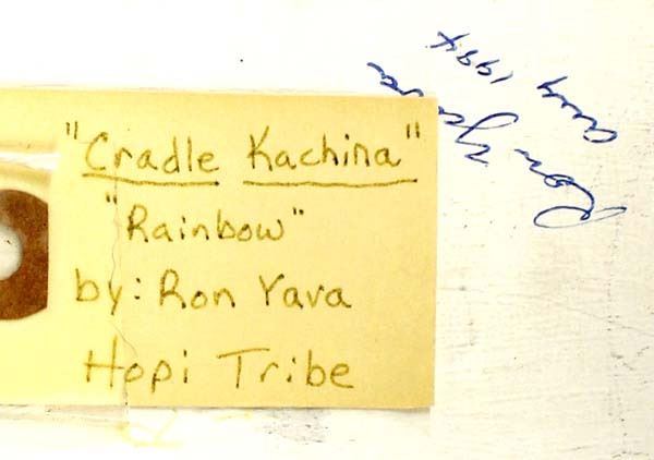 1994 Native American Hopi Rainbow ''Tanga' Kah'' Cradle Kachina by Ron Yava, measures 7.5''L x 3''W x 2''H, embellished with feathers, yarn, and beads, signed by the artist