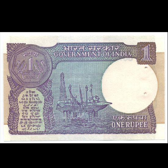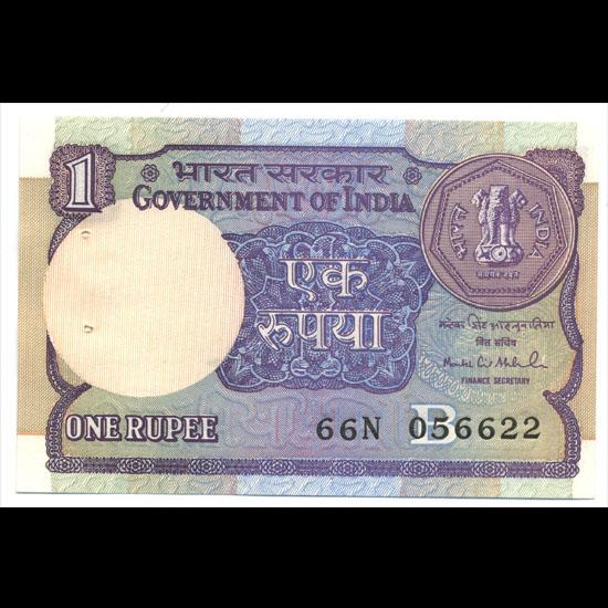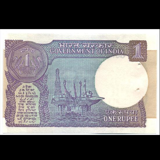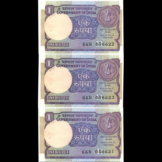 Scarce 1994 India 1 Rupee note set; 3 sequential serial numbers; Gem crisp uncirculated; customary Mint staple holes