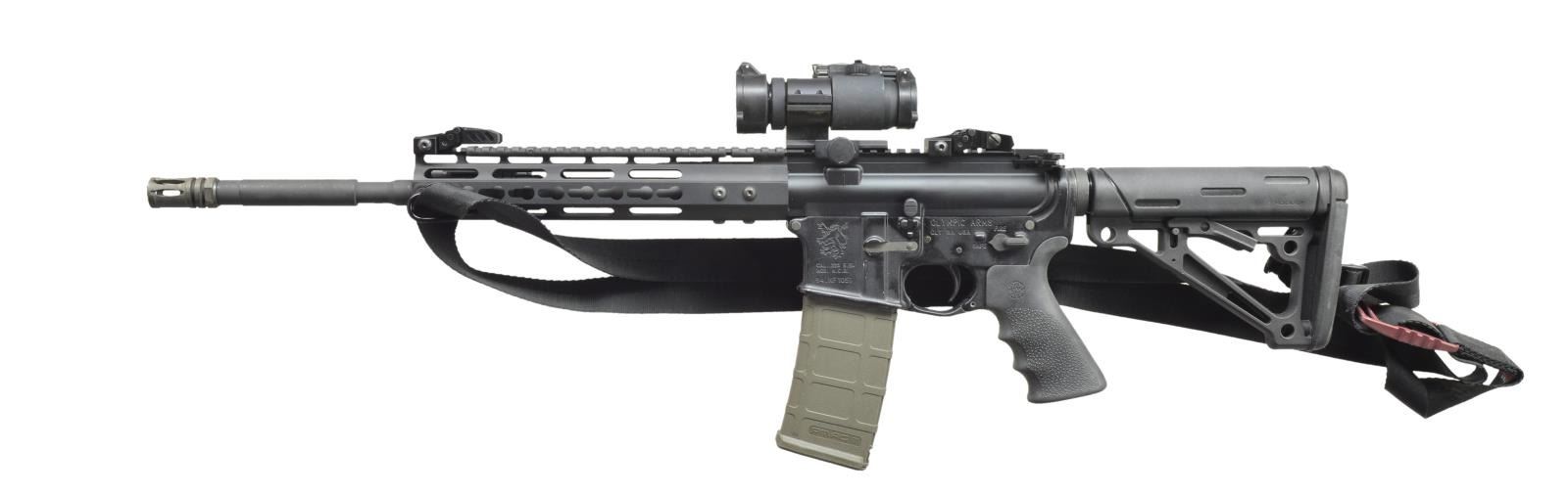 KEYMOD RAIL SYSTEM. Cal. 223. S# 94NF1051. Bbl. 16". Olympic Arms Black Rifle variant w/ M4 profile bbl. marked “5.56 NATO 1:8” terminated w/ threaded muzzle & A2 style flash hider. Low profile gas block beneath slim line Keymod free floating handguard w/ picatinny rail section at 12 o’clock providing 16" of mounting surface. O-Light Valkyrie PL-2 mounted at 3 o’clock. FA marked flat top upper receiver w/ brass deflector & rnd. forward assist. Folding back up iron sights, front & rear. Houge collapsible 6-position shoulder stock. Houge rubber pistol grip. Magpul enlarged trigger guard. Aimpoint variable red dot sight. U.S. mfg. black nylon sling. MAGS: 1-30 rd. Pmag. UNATTACHED ACCESSORIES: Blackhawk padded nylon carry case. CONDITION: satin black anodizing on upper receiver does a decent job matching the matte black Olympic Arms lower receiver finish parkerized bbl. retains complete coverage. PL2 Valkyrie & Aimpoint both appear functional. Shiny bore w/ decent rifling. Fire control mechanism appears to function correctly when cycled by hand. (21-1052/JZ). MODERN. $600-1,000.