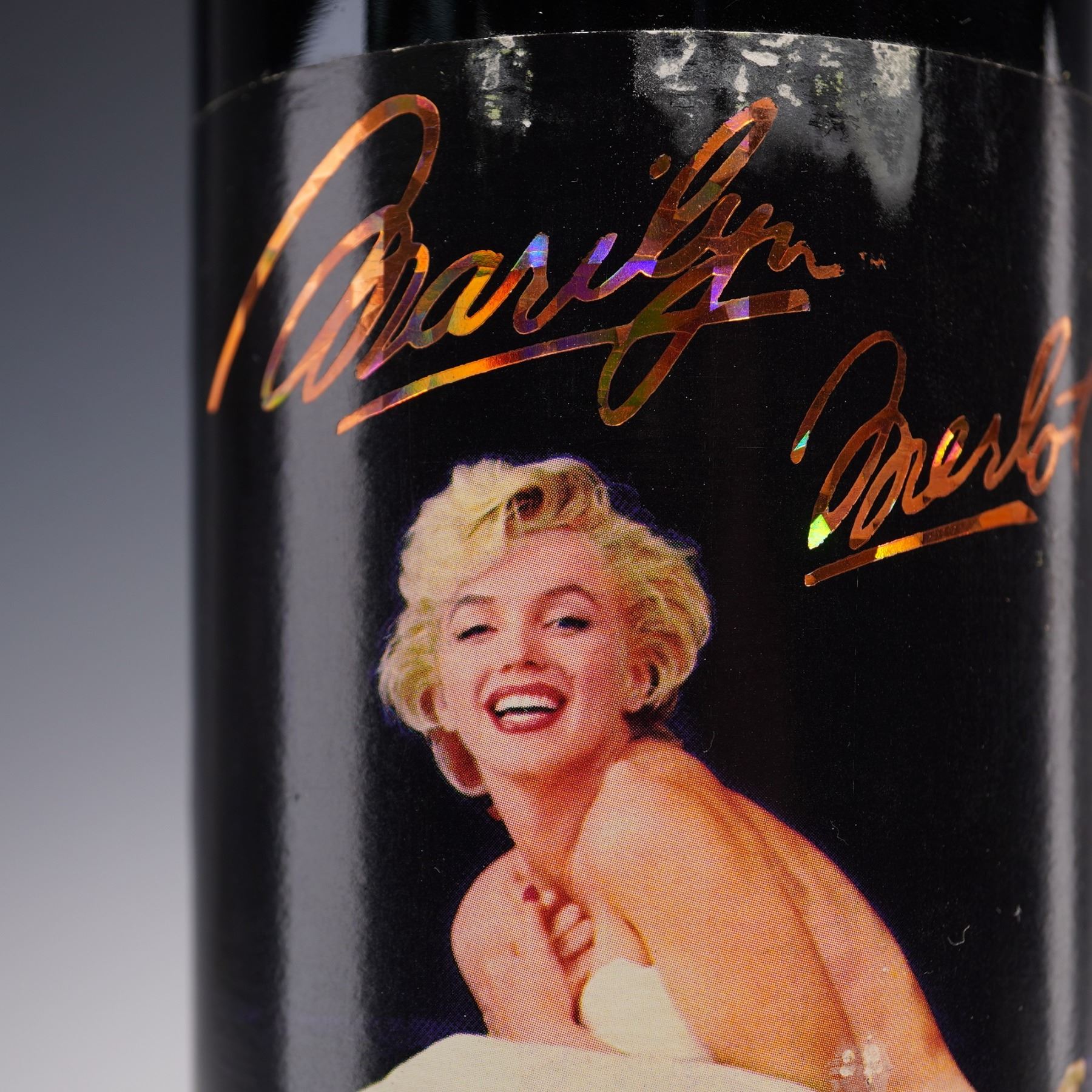 A collectible 750ml bottle of 1994 Marilyn Merlot wine featuring a vibrant label adorned with an iconic image of Marilyn Monroe in her famous white dress pose. The bottle is sealed with a unique cap embossed with gold-toned lips, enhancing its visual appeal for collectors. Produced and bottled by Marilyn Merlot in Oakville, California, this limited-edition vintage merges pop culture and fine winemaking. The back label provides bottler information and government health warnings. A must-have for wine enthusiasts and Marilyn Monroe memorabilia collectors alike. Measures 13"H.