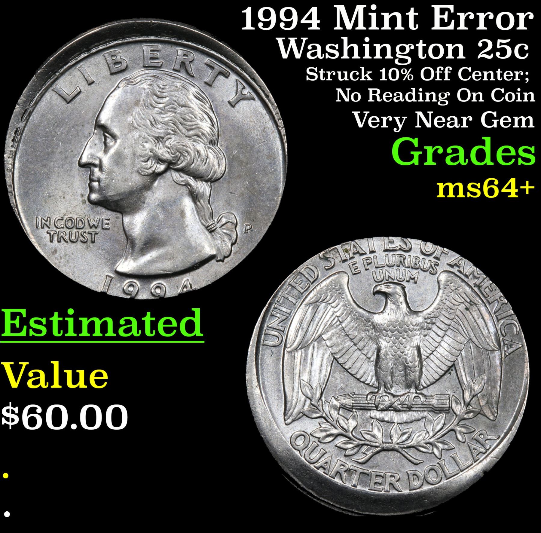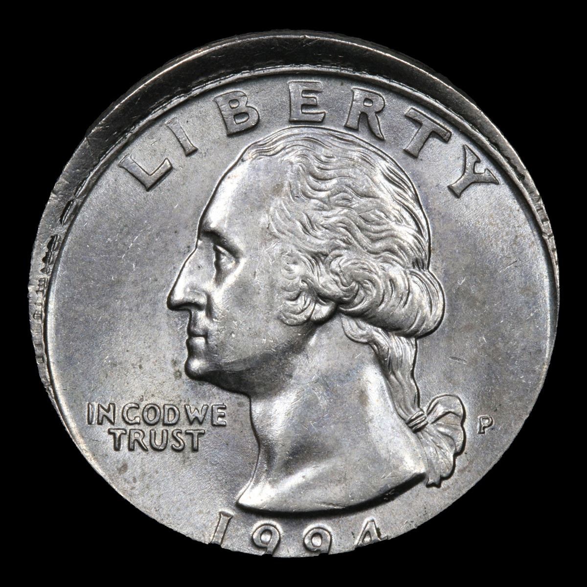 1994 Mint Error Struck 10% Off Center; No Reading On Coin Very Near Gem Washington Quarter 25c Grades Choice+ Unc.