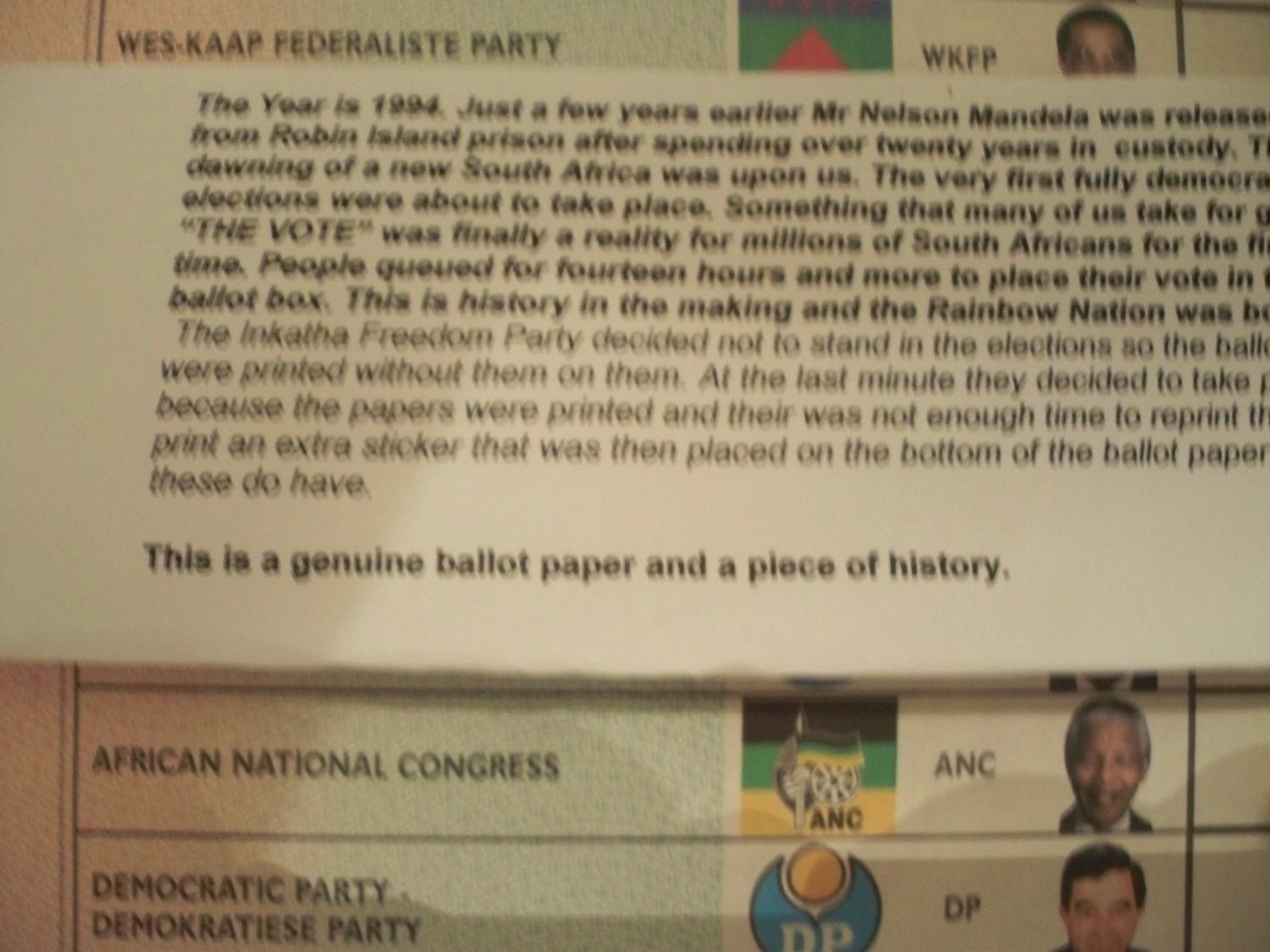 1994 Original South African Ballot Form Featuring Nelson Mandela In The First Open Elections
