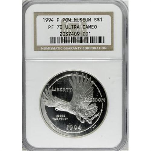<B>1994-P $1 P.O.W. Silver Dollar PR70 Ultra Cameo NGC.</B></I> This is a flawless proof example of the issue, which was struck to help support the proposed National Prisoner of War Museum in Andersonville, Georgia, which opened in 1998. This example has great contrast and seems pristine. <BR><BR><b>Shipping:</b> Coins & Currency (<a target="_blank" href="http://www.heritageauctions.com/common/shipping.php">view shipping information</a>)