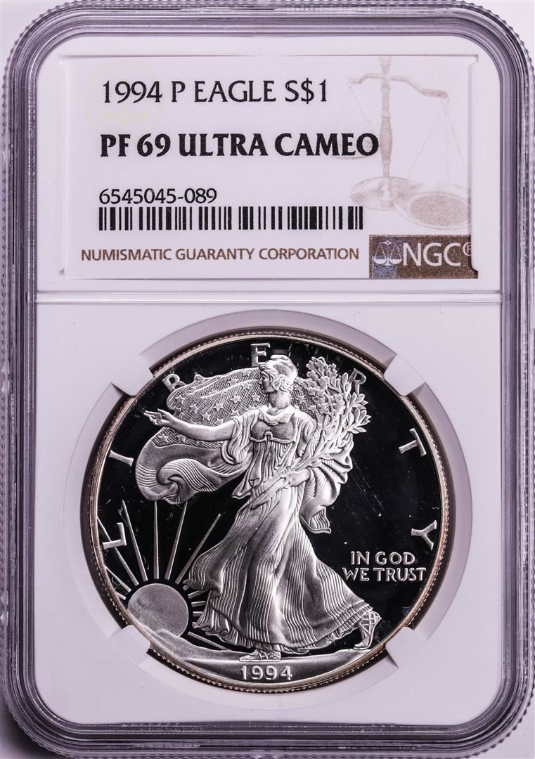 One 1994-P $1 Proof American Silver Eagle Coin NGC PF69 Ultra Cameo. NGC Certified.