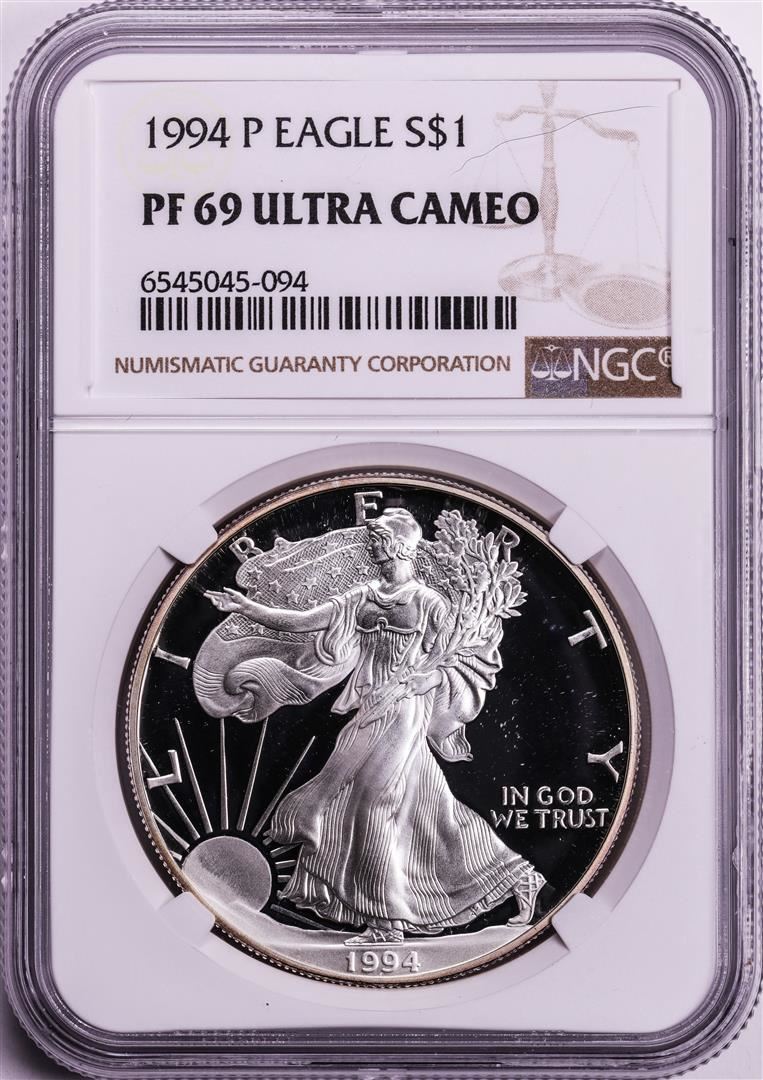 One 1994-P $1 Proof American Silver Eagle Coin NGC PF69 Ultra Cameo. NGC Certified.