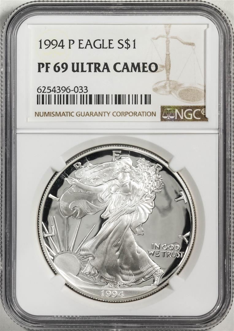 One 1994-P $1 Proof American Silver Eagle Coin NGC PF69 Ultra Cameo. NGC Certified.