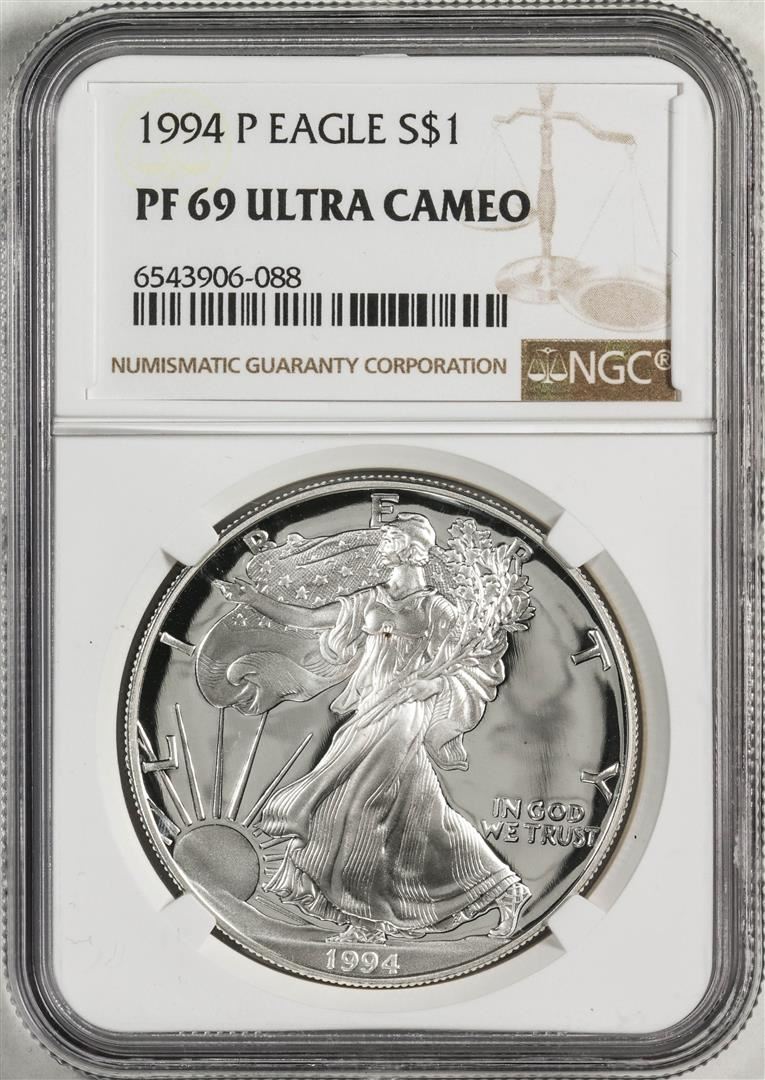 One 1994-P $1 Proof American Silver Eagle Coin NGC PF69 Ultra Cameo. NGC Certified.