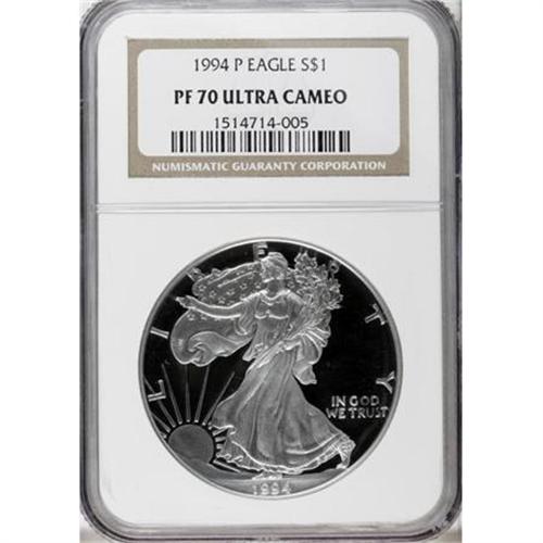 <B>1994-P $1 Silver Eagle PR70 Ultra Cameo NGC.</B></I> A perfect PR70 example of the highly popular and universally liked Walking Liberty design that was originally created by Adolph Weinman for the 1916 to 1947 half dollars. The amazing Ultra Cameo contrast of this piece brings the design up to its full potential.<BR><BR><b>Shipping:</b> Coins & Currency (<a target="_blank" href="http://www.heritageauctions.com/common/shipping.php">view shipping information</a>)