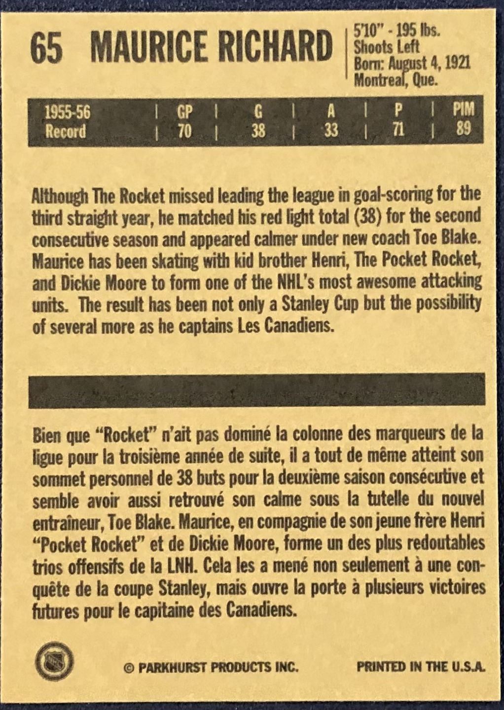 Card #65 NHL, hockey, hall of fame
