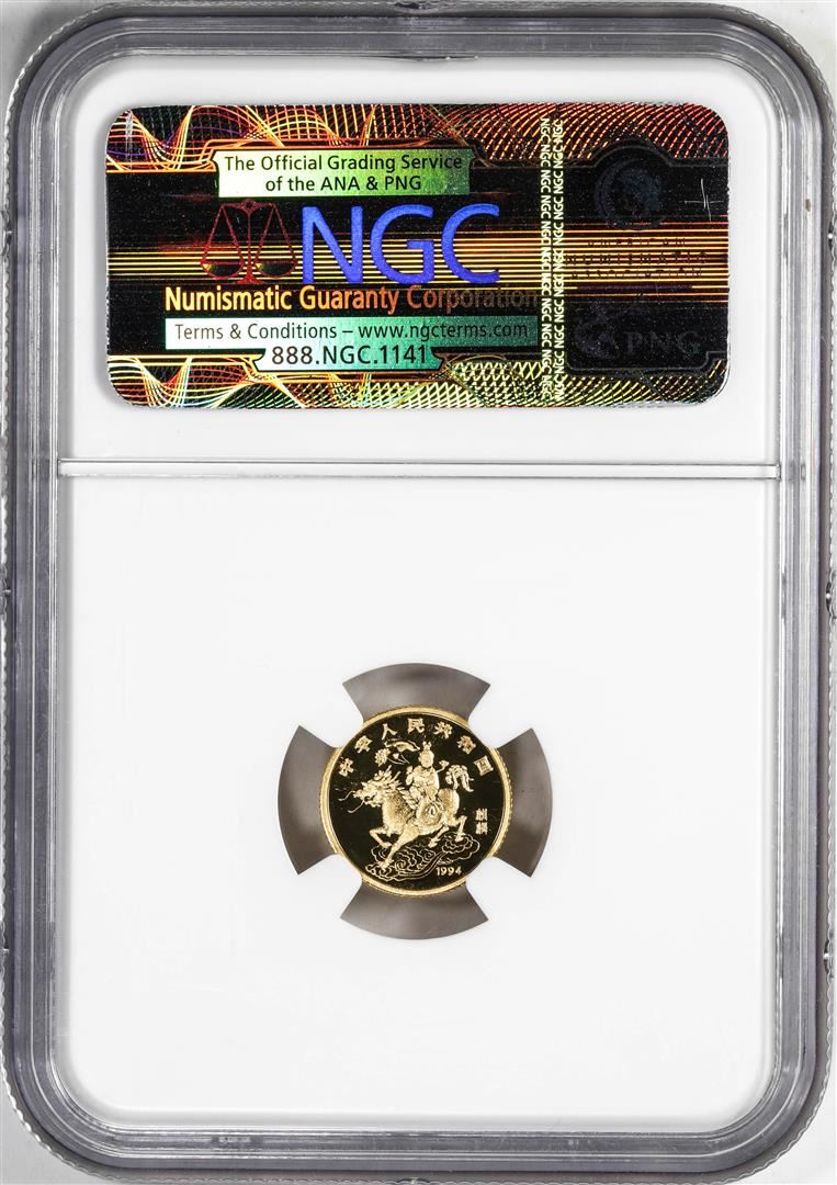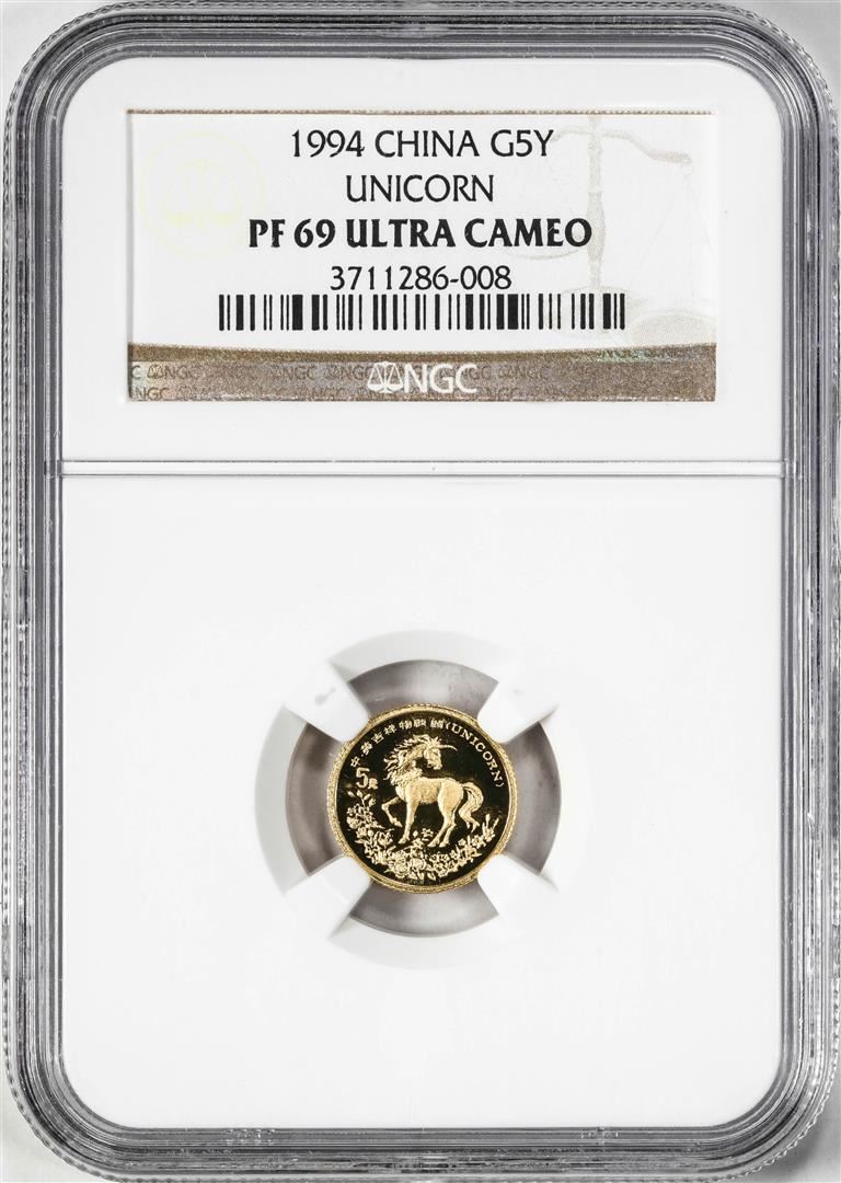 One 1994 Proof China 5 Yuan Proof Unicorn Gold Coin NGC PF69 Ultra Cameo. NGC Certified.