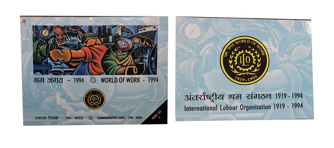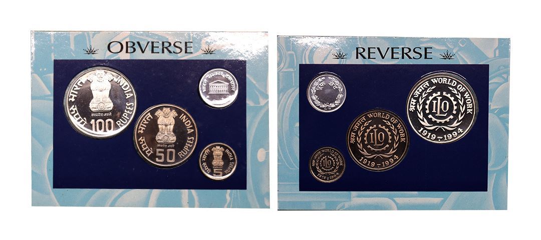 1994 Proof Set, World of work, set of 3, Rupees 5 to 100. In immaculate condition, within original packaging, Rare. (3); ( from the collection of Mr. I. K. Kejriwal ).