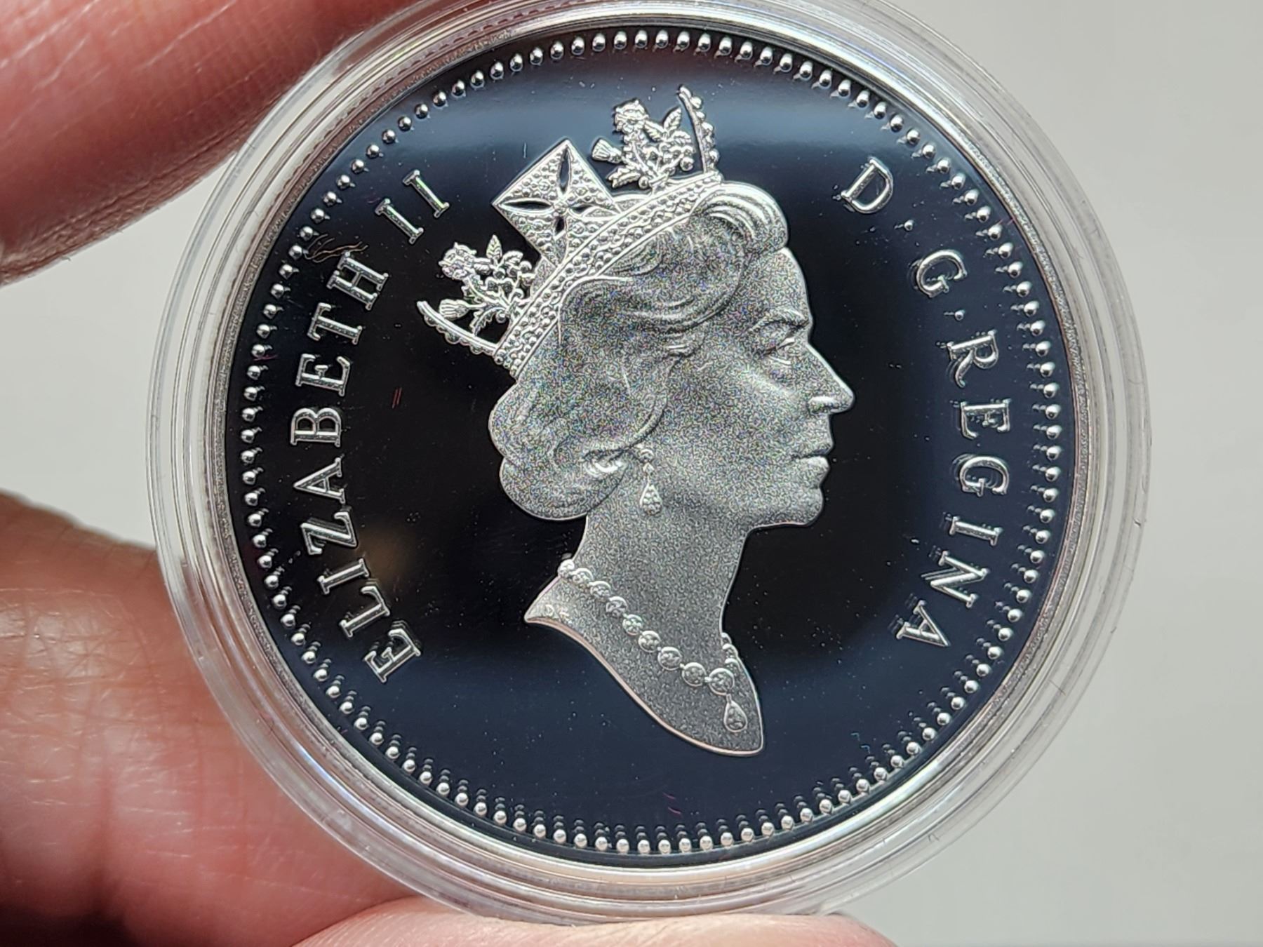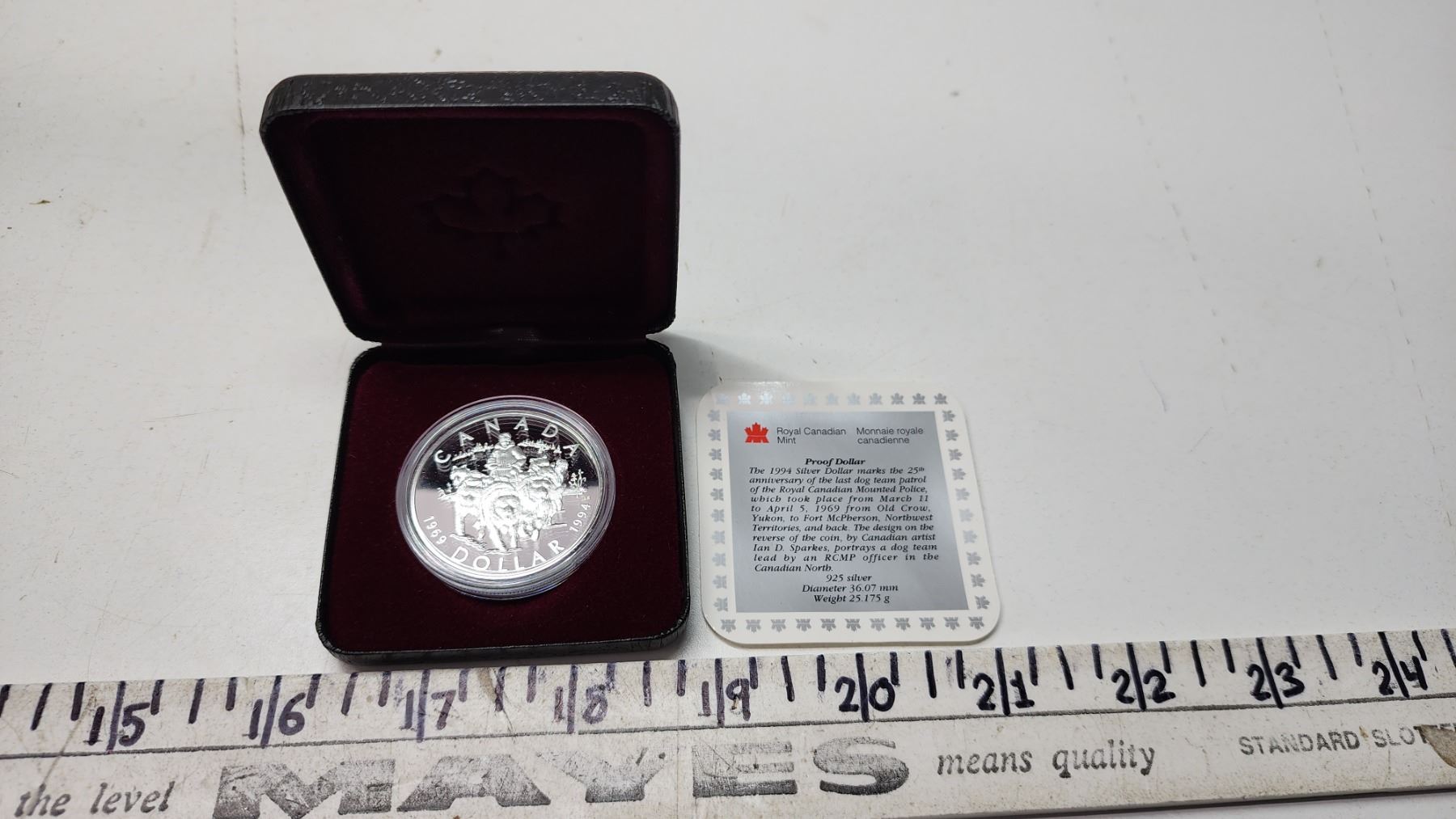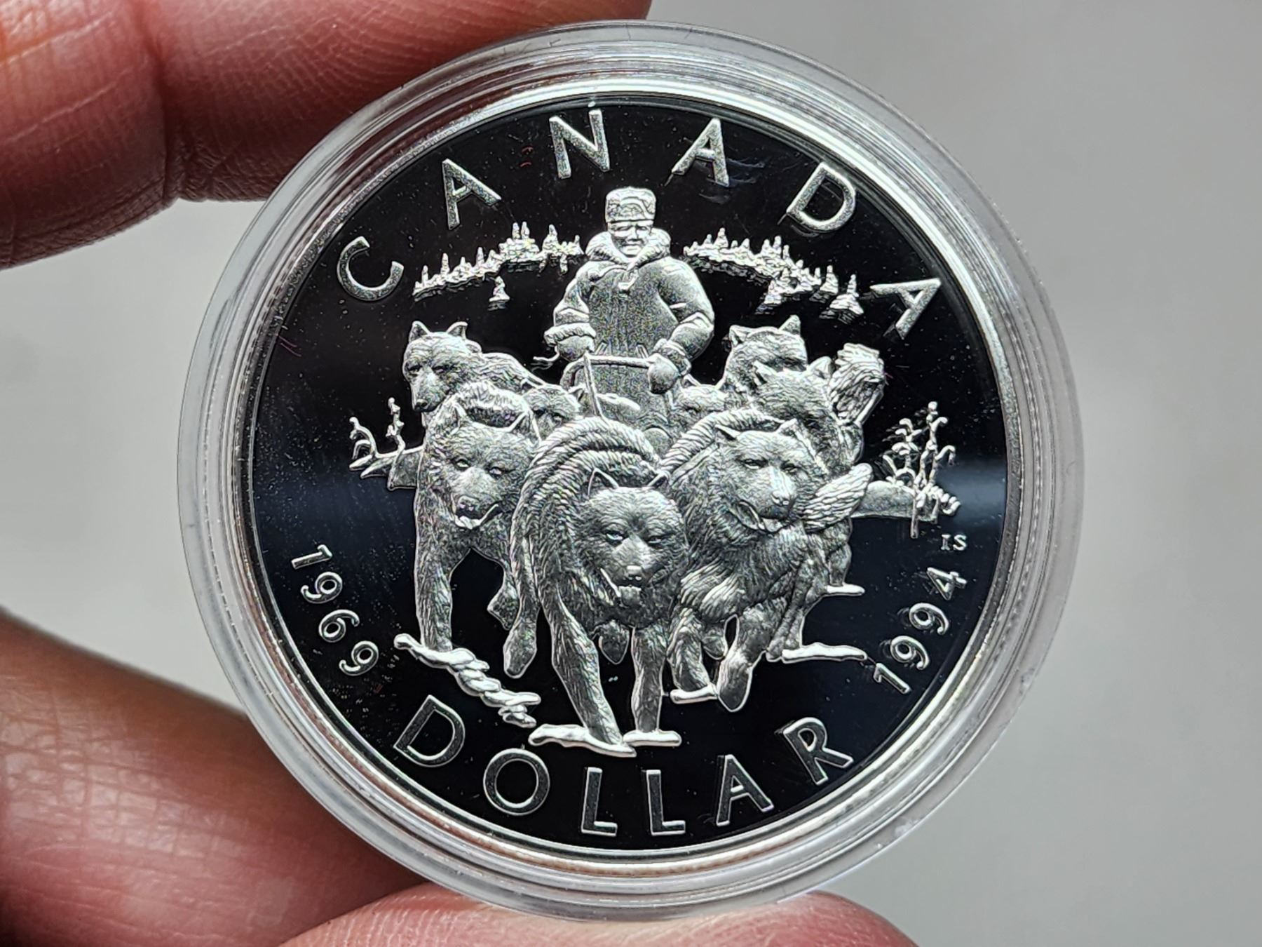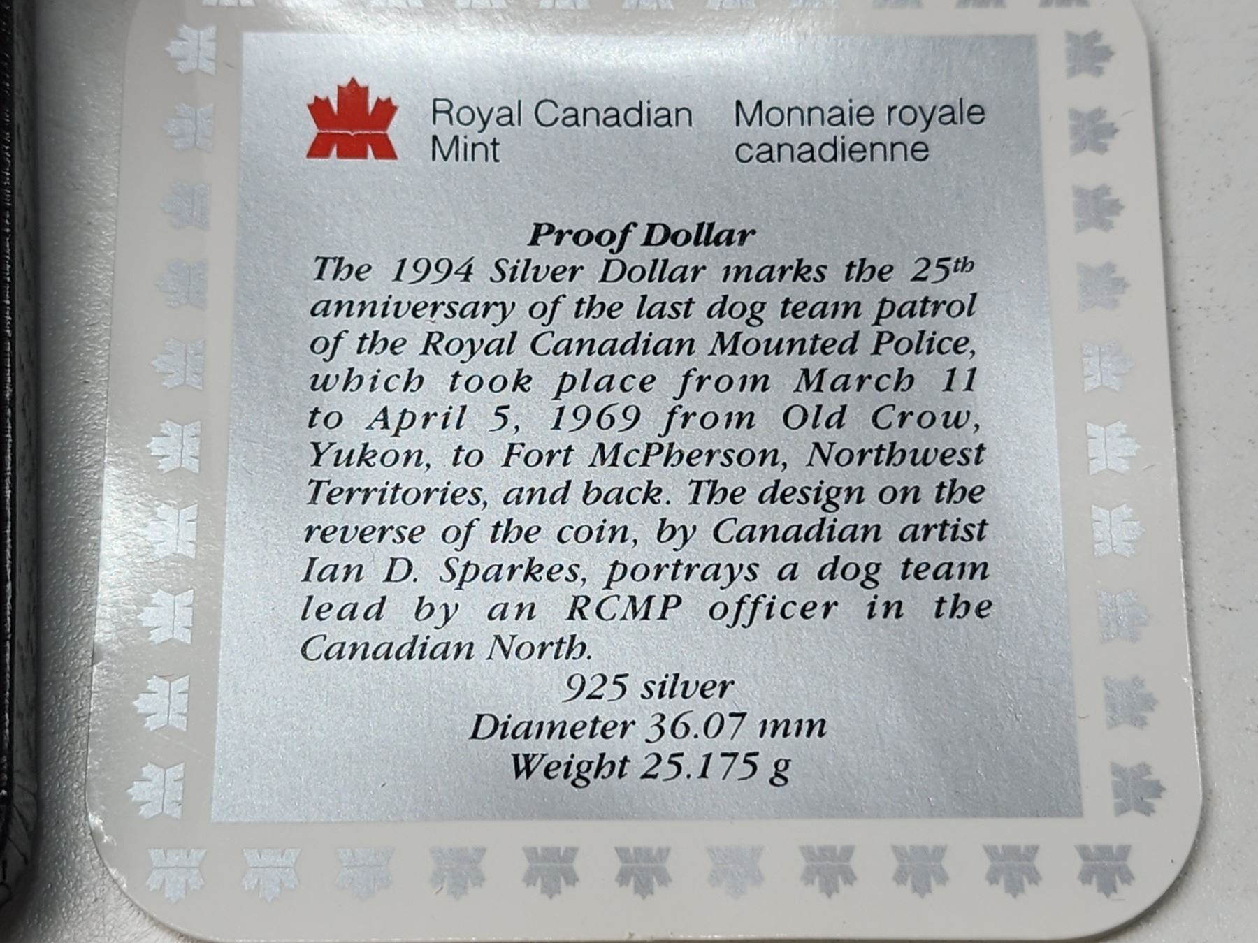 1994 RCMP Silver Dollar. Commemorates the last RCMP Dog Team Patrol. Proof with Ultra Heavy Cameo. Bright White. Housed in its original RCM case of issue.