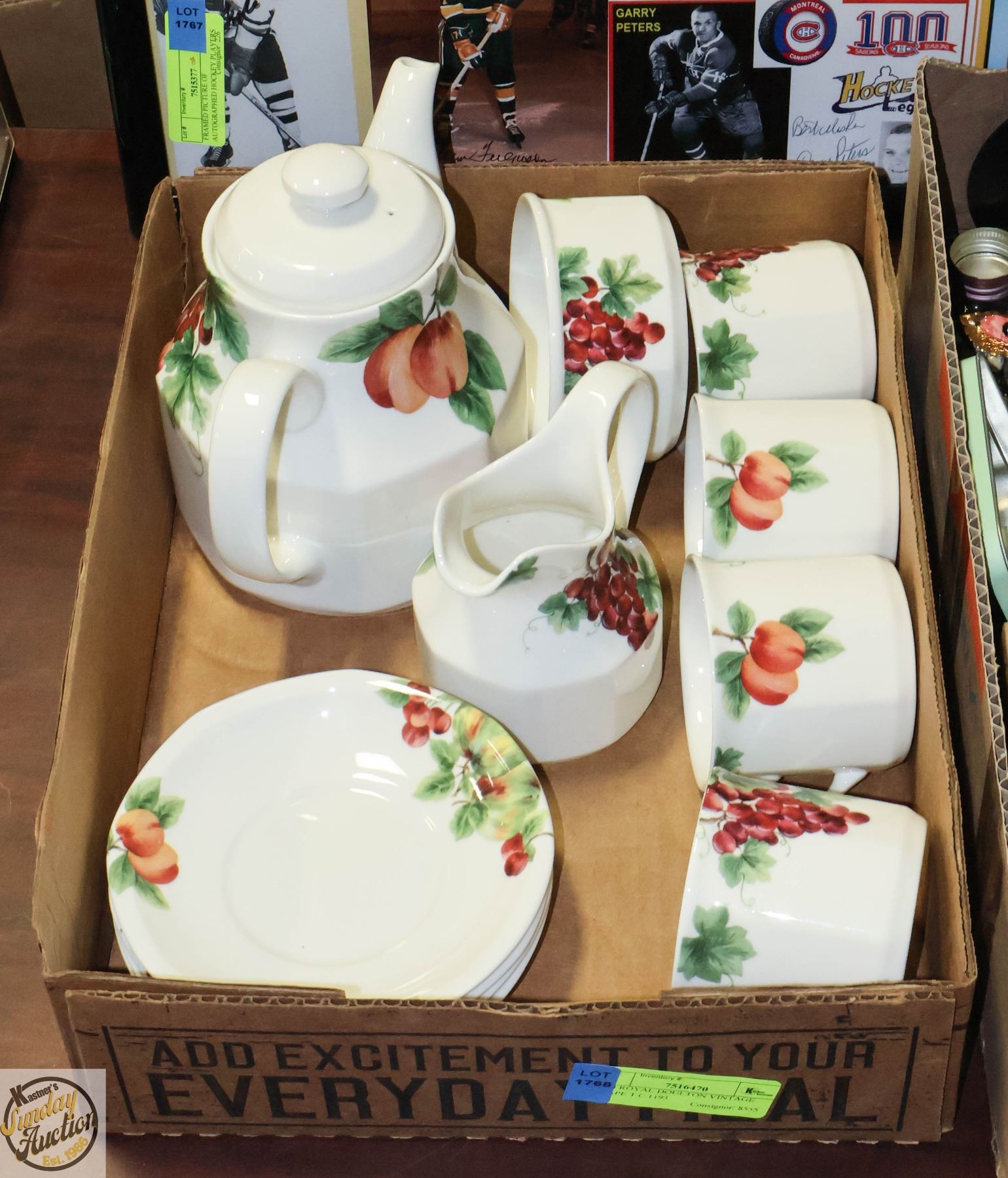 TEAPOT + 4 TEACUPS W/SAUCERS WITH CREAM/SUGAR DISHES **ALL ITEMS MUST BE REMOVED BY 5PM SATURDAY, JUNE 28th 2025. ALL REMAINING ITEMS WILL BE SUBJECT TO A $6.00 PER DAY STORAGE CHARGE. ANY ITEMS REMAINING AFTER MONDAY, JULY 14TH 2025 WILL BE CONSIDERED FORFEITED. NO REFUNDS WILL BE ISSUED FOR FORFEITED ITEMS. TO SCHEDULE A PICK UP APPOINTMENT CLICK HERE
