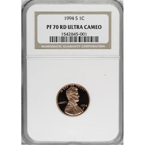 <B>1994-S 1C PR70 Deep Cameo NGC.</B></I> NGC Census: (51/0). PCGS Population (64/0). Numismedia Wsl. Price for NGC/PCGS coin in PR70: $200. (#93515)<BR><BR><b>Shipping:</b> Coins & Currency (<a target="_blank" href="http://www.heritageauctions.com/common/shipping.php">view shipping information</a>\)