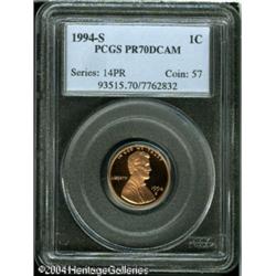 1994-S 1C PR70 Deep Cameo PCGS. A magnificent razo <B>1994-S 1C PR70 Deep Cameo PCGS.</B></I> A magnificent razor-sharp representative with nary a trace of carbon or contact. An exquisite example of the stellar production quality of the modern San Francisco Mint. Population: 38 in 70 (10/04). <BR><BR><B>Important notice:</B> Heritage usually auctions material at the rate of 200-250 lots per hour. On some occasions eBay Live bid software or the Internet may not be able to keep up with the pace of the auction. We recommend placing a realistic absentee bid now as insurance to avoid disappointment. Occasionally the auctioneer may eliminate or reject an eBay Live bid, and the auctioneer may also reopen a lot after the close of the eBay live bidding (usually because we missed an audience bid), and may reject your bid even if it shows you as the winning bidder. By bidding via eBay Live, you agree that Heritage may award the lot to another bidder at its sole discretion under the circumstances described above or any other reasonable circumstances. Since eBay bids are not shown to us until we open the lot on the floor, we treat those bids just like floor bids. In most cases the floor responds before the eBay bid is presented to us, due to Internet lag time, so for consistency we have made it a policy that floor bids are always considered first over tie eBay live bids. Also please note that all Heritage lots purchased through eBay Live carry a 20% Buyer's Premium. Please make sure you read the Terms and Conditions before you bid. This lot is being auctioned in conjunction with a live floor auction by Heritage Galleries & Auctioneers. All final auction and invoice information will be supplied by Heritage Galleries & Auctioneers, and all other information should be considered preliminary. Lot:5461