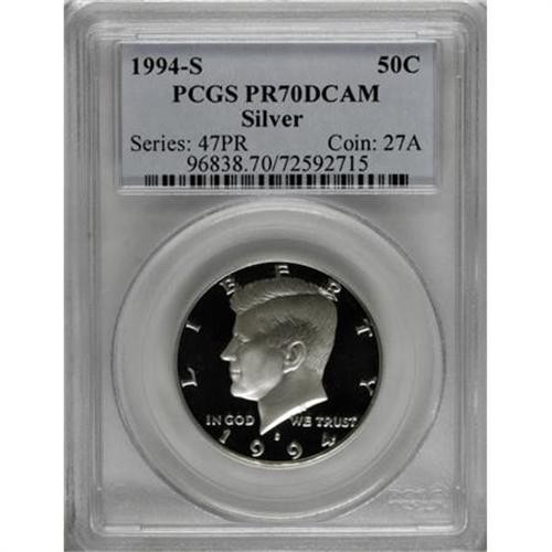 <B>1994-S 50C Silver PR70 Deep Cameo PCGS.</B></I> PCGS Population (61/0). NGC Census: (95/0). Numismedia Wsl. Price for NGC/PCGS coin in PR70: $300. (#96838)<BR><BR><b>Shipping:</b> Coins & Currency (<a target="_blank" href="http://www.heritageauctions.com/common/shipping.php">view shipping information</a>)