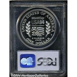 <B>1994-S<S$1> World Cup Silver Dollar PR70 Deep Cameo PCGS.</B></I> A hint of gold color illuminates the borders of this immaculate and fully struck specimen. The icy-white devices exhibit unimprovable white on black contrast. Population: 6 in 70 Deep Cameo (6/04). <BR><BR><B>Important notice:</B> Heritage usually auctions material at the rate of 200-250 lots per hour. On some occasions eBay Live bid software or the Internet may not be able to keep up with the pace of the auction. We recommend placing a realistic absentee bid now as insurance to avoid disappointment. Occasionally the auctioneer may eliminate or reject an eBay Live bid, and the auctioneer may also reopen a lot after the close of the eBay live bidding (usually because we missed an audience bid), and may reject your bid even if it shows you as the winning bidder. By bidding via eBay Live, you agree that Heritage may award the lot to another bidder at its sole discretion under the circumstances described above or any other reasonable circumstances. Since eBay bids are not shown to us until we open the lot on the floor, we treat those bids just like floor bids. In most cases the floor responds before the eBay bid is presented to us, due to Internet lag time, so for consistency we have made it a policy that floor bids are always considered first over tie eBay live bids. Also please note that all Heritage lots purchased through eBay Live carry a 20% Buyer's Premium. Please make sure you read the Terms and Conditions before you bid. </span></font></tr></table></td></tr></table>