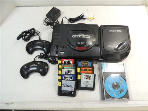 1994 SEGA GENESIS CONSOLE & CD, 2 CONTROLLERS, VIDEO CONNECTOR, 8 GAMES: MADDEN 1992, MADDEN 1995, MADDEN 1994, NBA 1996, DITKA, SHAQ-FU, NBA 1995, NHL 1994. AS SHOWN. VIEW PICTURE FOR DETAIL.
