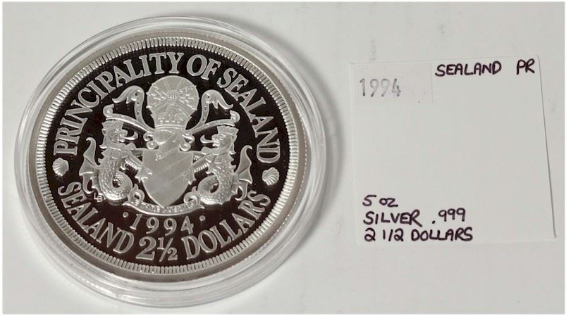 1994 Sealand Principality Two and a half Dollar 5oz .999 Fine Silver coin in proof Condition. Limited Mintage to only 500 coins issued Worldwide!! Coin comes encapsulated.(tax exempt)