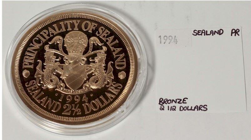 1994 Sealand Principality Two and a half Dollar BRONZE coin in proof Condition. Coin comes encapsulated however the capsule is impaired. Limited Mintage 10,000 worldwide.