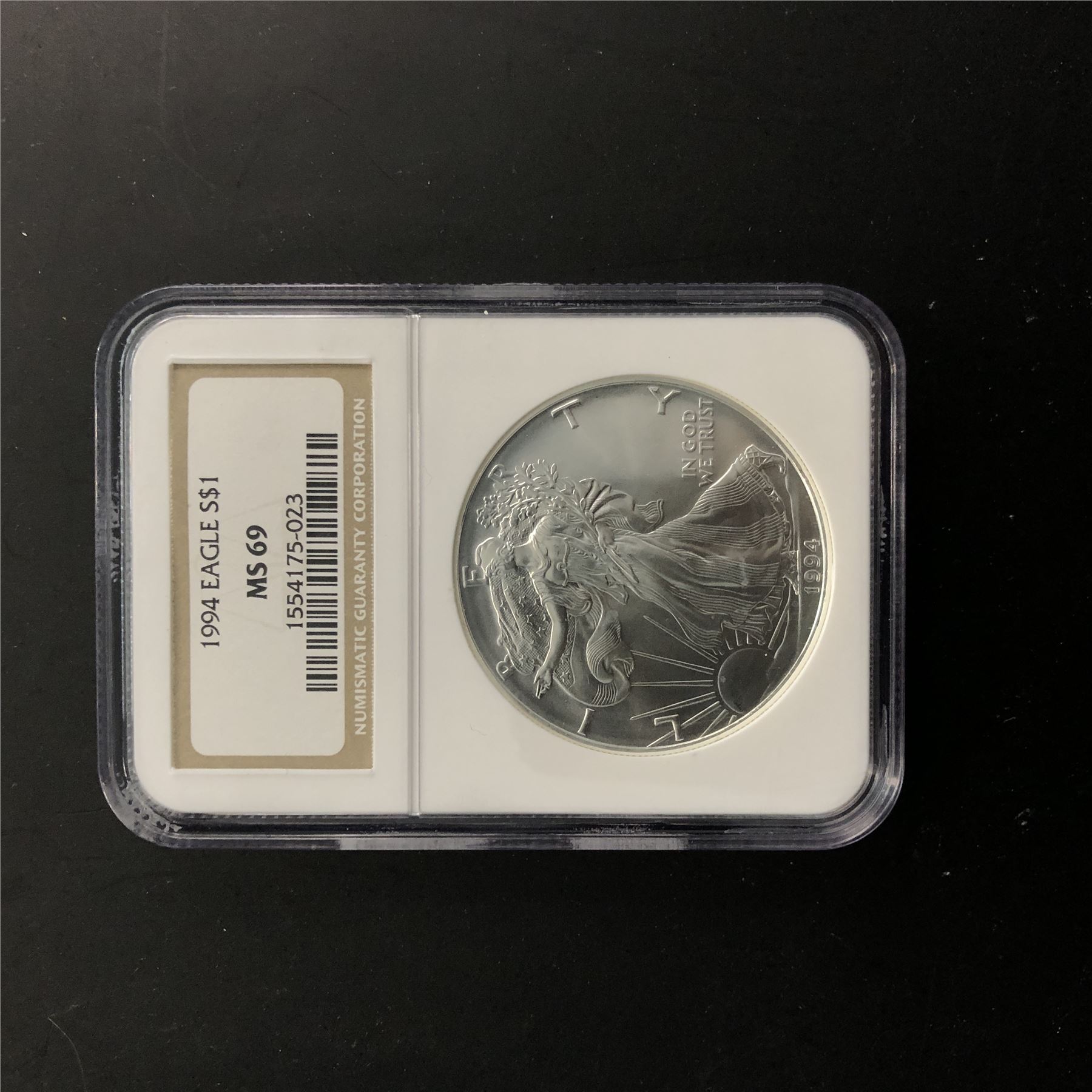 A 1994 Silver American Eagle Dollar NGC graded MS69. Currently the highest priced standard Silver Eagle, this coin is a gem. Absolute stunning luster and great eye appeal. Key Date in this grade.