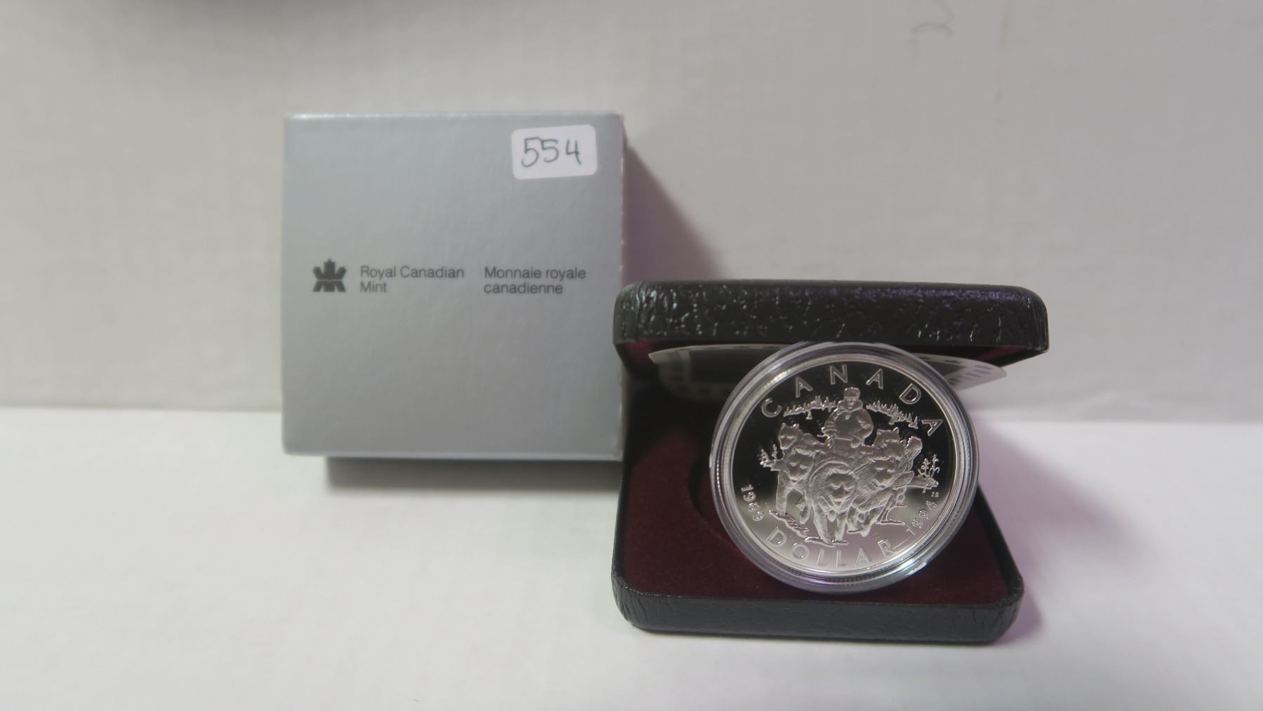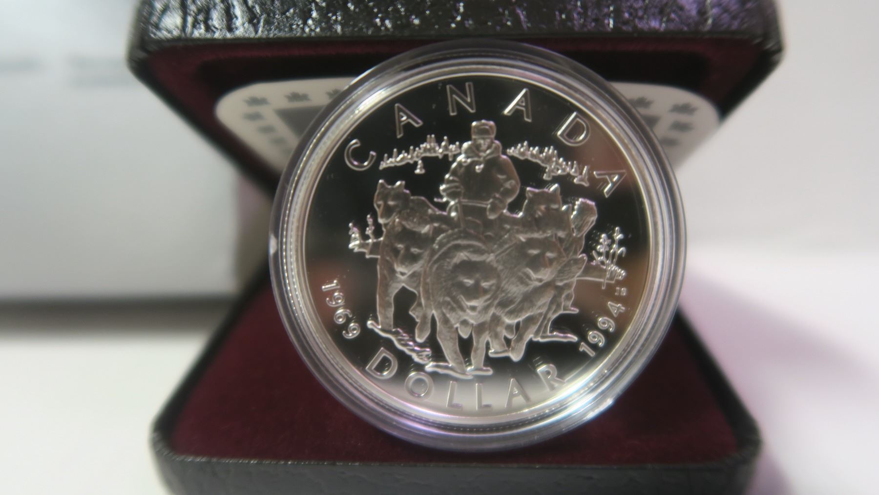 1994 Silver Dollar. Commemorates the 25th Anniversary of the last RCMP Northern Dog Team Patrol. Sterling Silver. Proof with Ultra Heavy Cameo. Housed in its original case of issue.