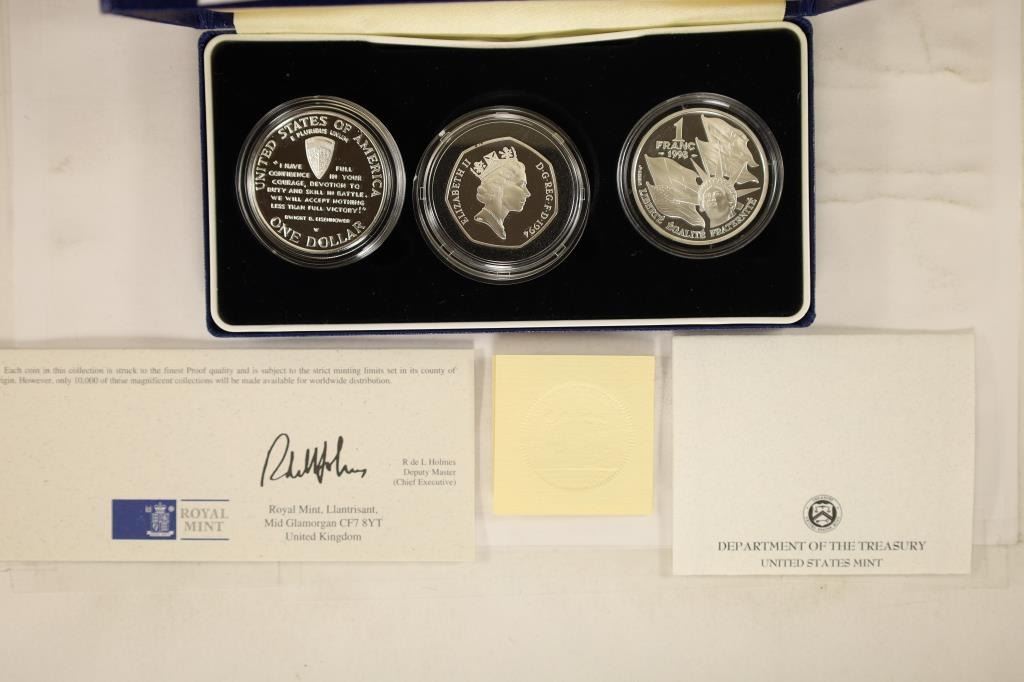 THE 50TH ANNIVERSARY OF THE ALLIED INVASION OF EUROPE. CONTAINS: 1991-W PROOF SILVER DOLLAR, 1993 FRANCE ONE FRANC PROOF COIN AND 1994 UNITED KINGDOM 50 PENCE COIN. ORIGINAL MINT PACKAGING WITH CERTIFICATES, NO OUTER