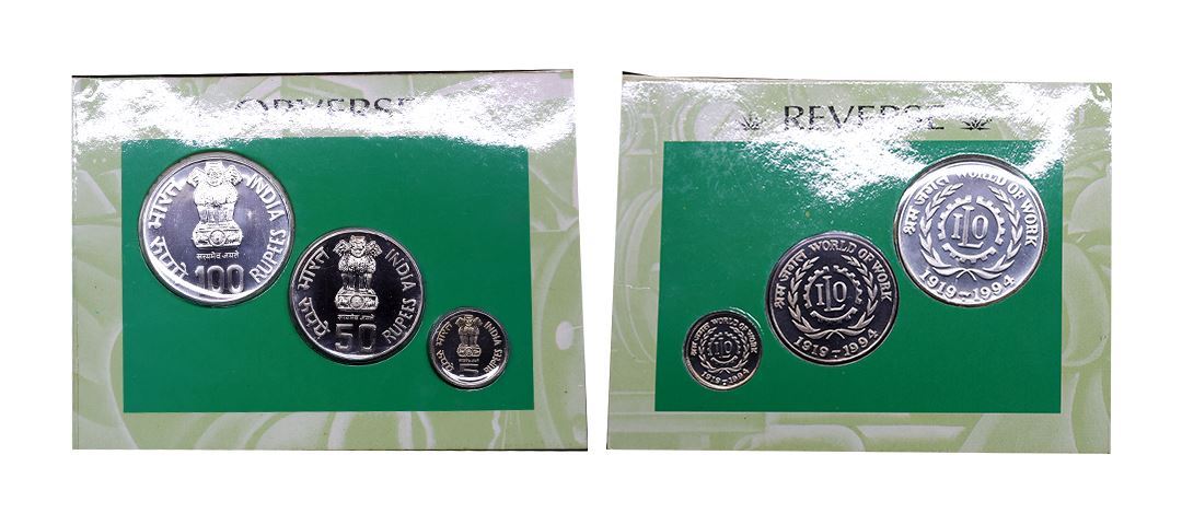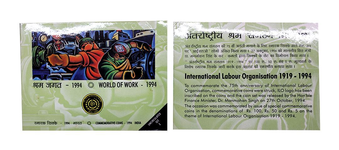 1994 Uncirculated Set, World of work, set of 3, Rupees 5 to 100. In immaculate condition, within original packaging, Rare. (3); ( from the collection of Mr. I. K. Kejriwal ).