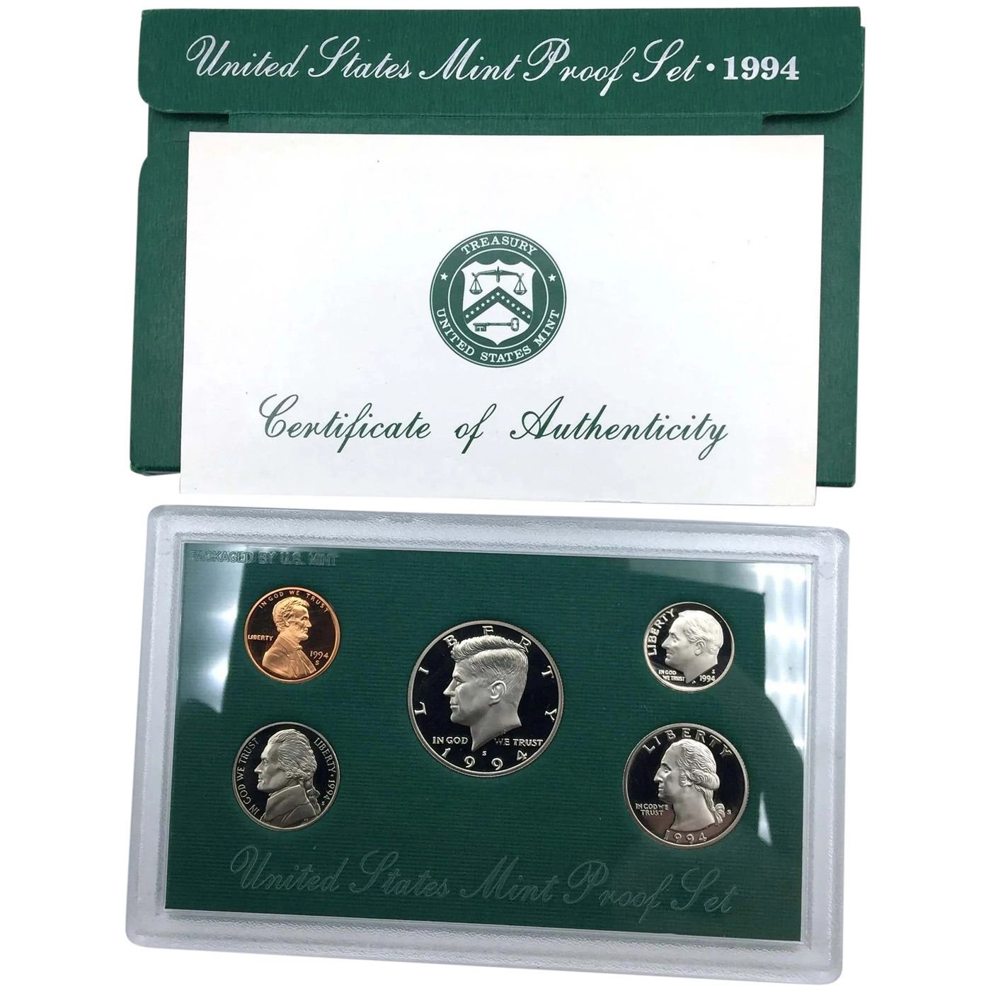 1994 United States Proof Set, 5 Coins Inside!. Original packaging: The coins of the 1994-S Proof Set were placed in individual holes in a green-colored, textured paper and cardboard insert, then sealed in a two-piece, clear plastic case. The case was then inserted, along with a Certificate of Authenticity, into a protective outer cover, consisting of green cardboard imprinted with the somewhat confusing silver words: "United States Mint Proof Set • 1994." The new collector might ask, "Is this a Mint Set or a Proof Set?"