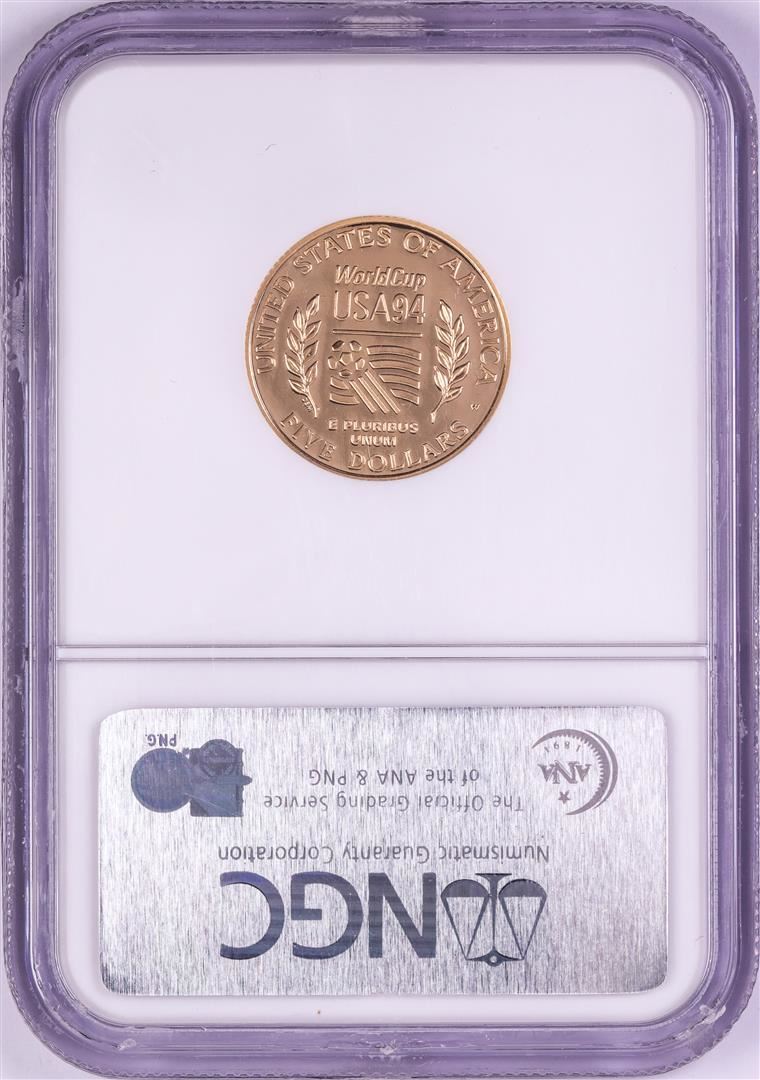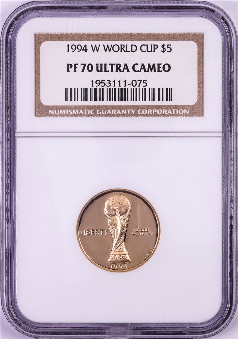 One 1994-W $5 Proof World Cup Commemorative Gold Coin NGC PF70 Ultra Cameo. NGC Certified.