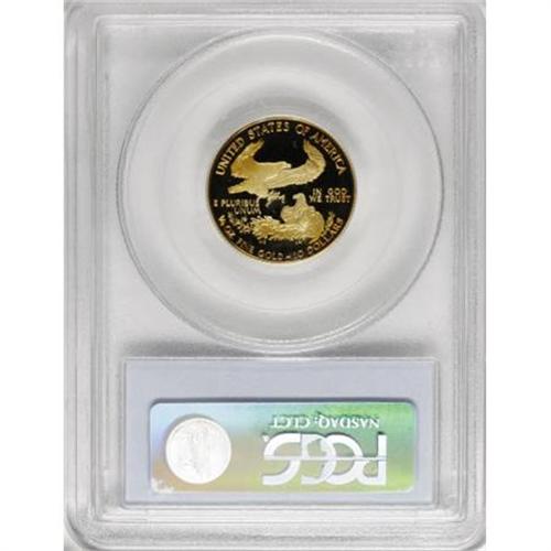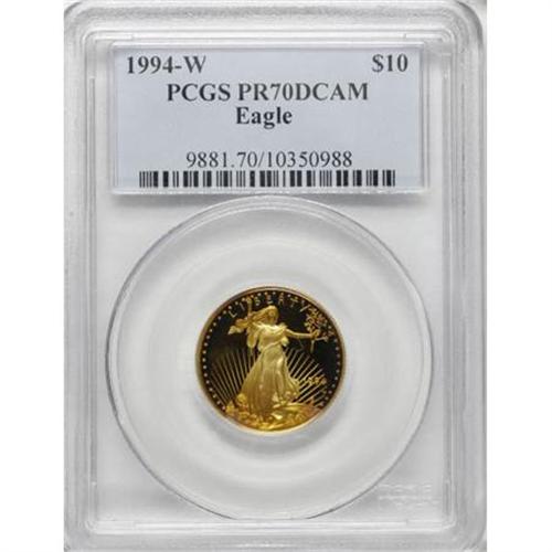 <B>1994-W G$10 Quarter-Ounce Gold Eagle PR70 Deep Cameo PCGS.</B></I> Beautifully deep shades of amber-gold and lime-green decorate the pristine surfaces of this gold eagle. The "W" mintmark indicates that it was struck at the West Point Mint, and the PR70 grade denotes flawless preservation. Deep Cameo contrast is likewise evident on both sides. Population: 27 in 70 Deep Cameo (11/07). <BR><BR><b>Shipping:</b> Coins & Currency (<a target="_blank" href="http://www.heritageauctions.com/common/shipping.php">view shipping information</a>)