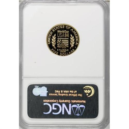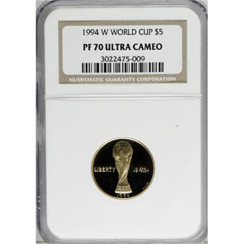 <B>1994-W G$5 World Cup Gold Five Dollar PR70 Deep Cameo NGC.</B></I> NGC Census: (0/0). PCGS Population (9/0). Mintage: 89,619. Numismedia Wsl. Price for NGC/PCGS coin in PR70: $575. (#9685)<BR><BR><b>Shipping:</b> Coins & Currency (<a target="_blank" href="http://www.heritageauctions.com/common/shipping.php">view shipping information</a>)