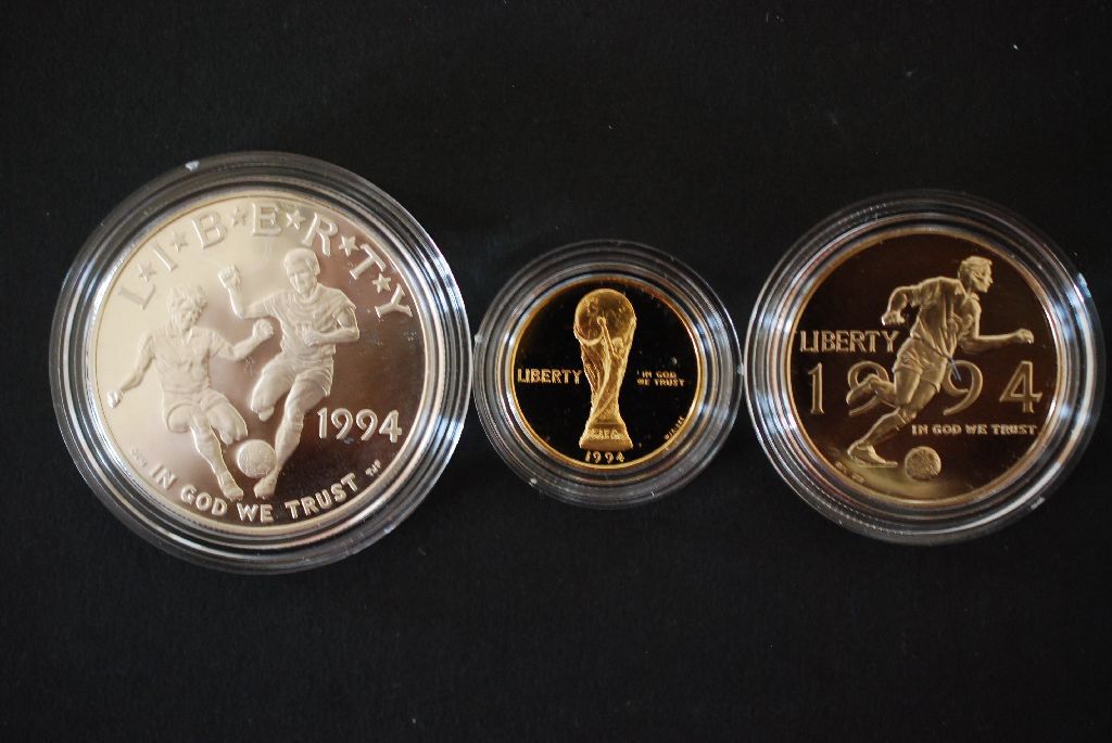 1994-W US World Cup Commerative $5 Gold Coin Proof; 90% Gold 8.359 Grams, 1994-S US World Cup Commerative Silver $1 Proof; 90% Silver 0.76 Oz. & 1994-P US World Cup Commerative CLAD Half Dollar Proof; 92% Copper 11.340 Grams; EST. $400-450