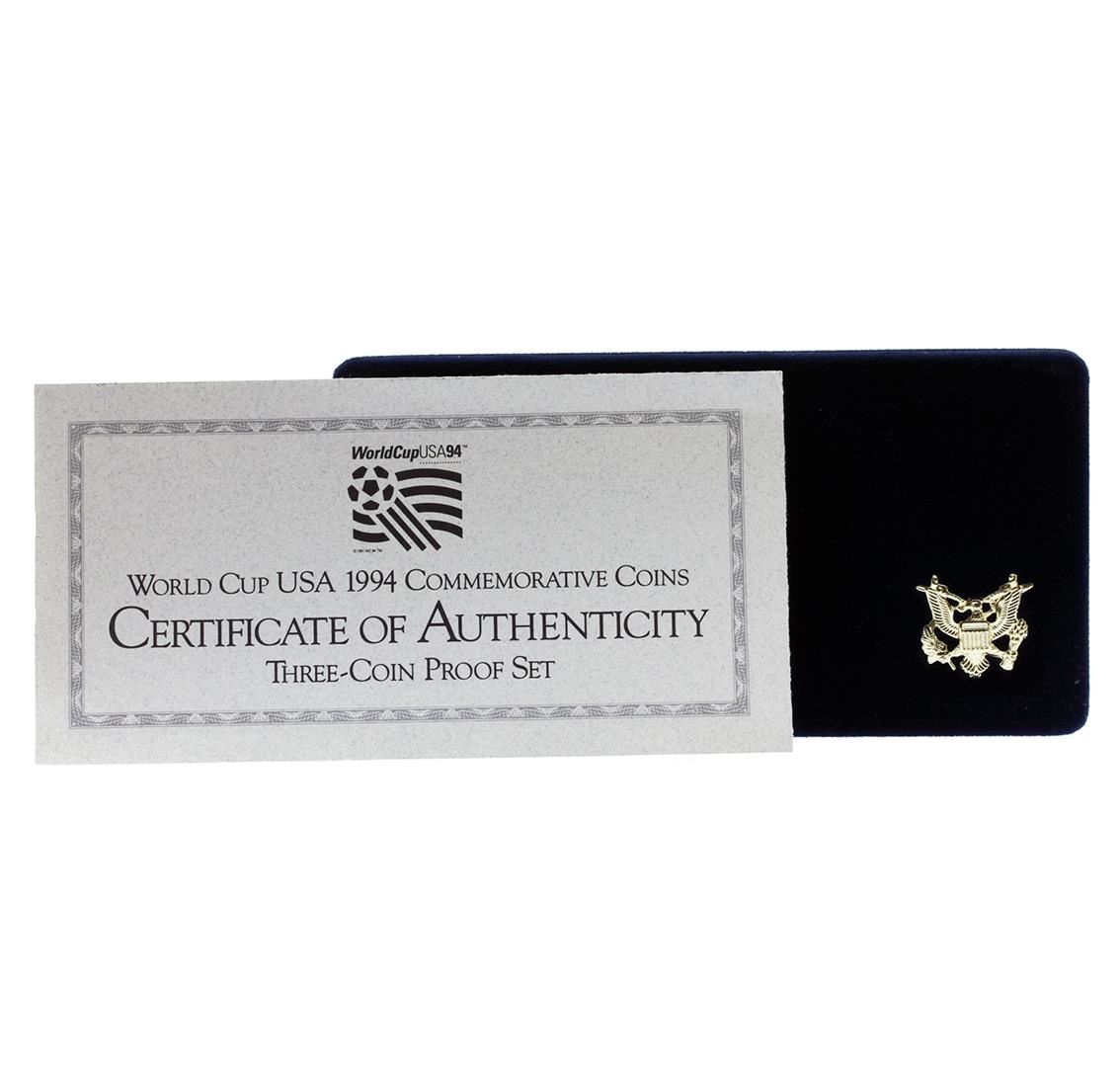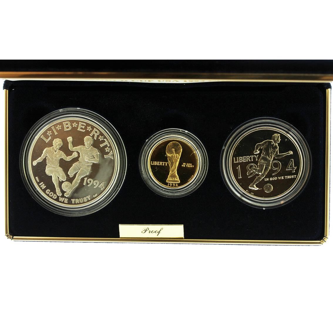 (1) 1994-W US Gold $5 World Cup Proof weighing approximately 8.359 grams, (1) 1994-S US World Cup Silver Dollar Proof weighing approximately 26.730 grams, and (1) 1994-P US World Cup Clad Half Dollar Proof weighing approximately weighing approximately 11.340 grams.