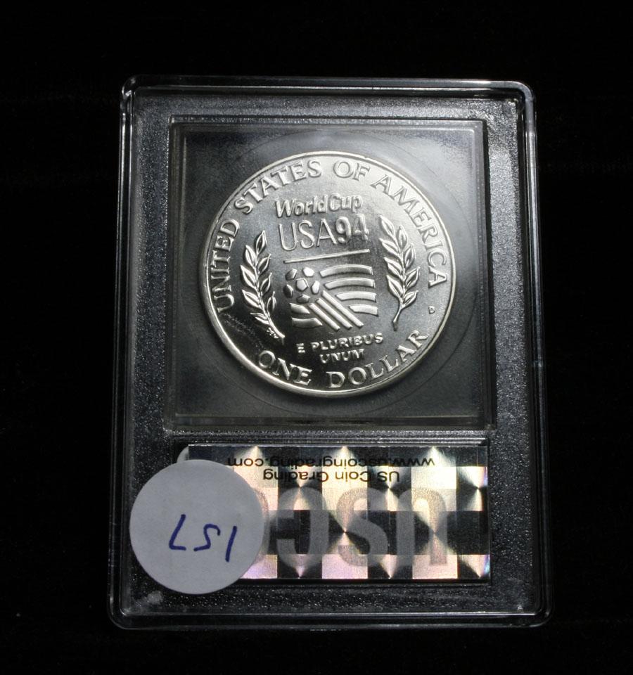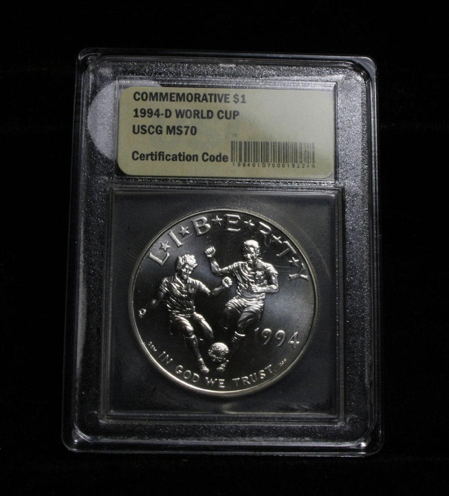 The 1994 World Cup Silver Dollar was issued as part of a three coin program to celebrate the XV FIFA World Cup playoff. The final game was held in the Rose Bowl in Pasadena, California. This coin is encapsulated and Graded ms70 by USCG. PCGS lists ms70 as $1000. Estimated Value $200