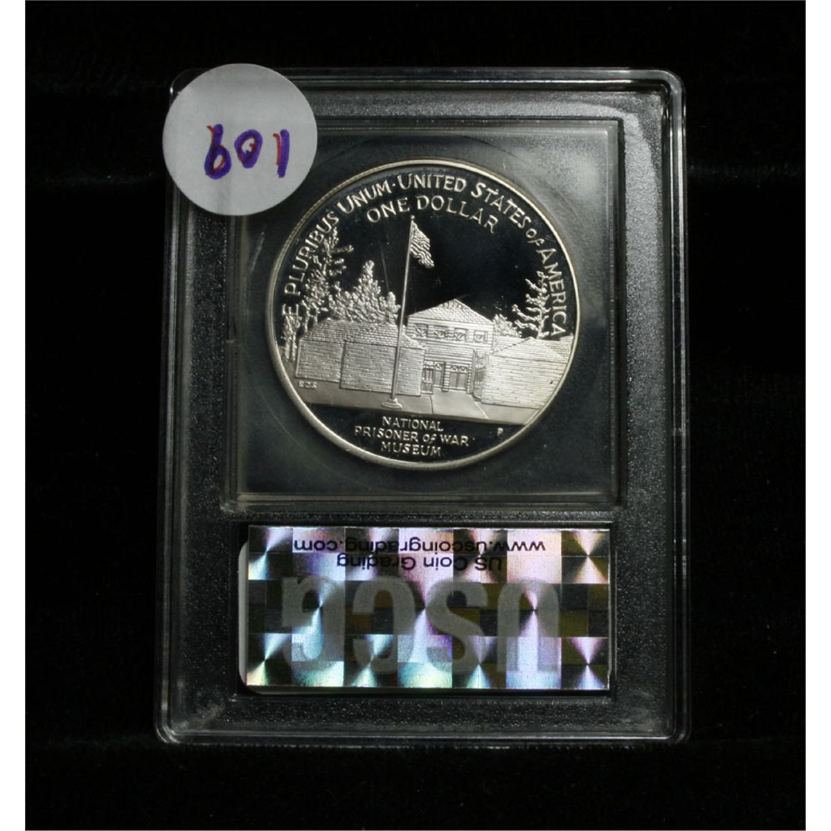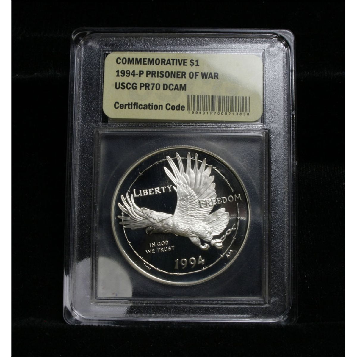 The 1994 Prisoner of War Memorial Silver Dollar was issued for the Prisoner of War Memorial Museum to be built in Andersonville, Georgia. PCGS lists PR70 DCAM at $2500. This coin is graded PR70 DCAM by USCG. Estimated Value $500